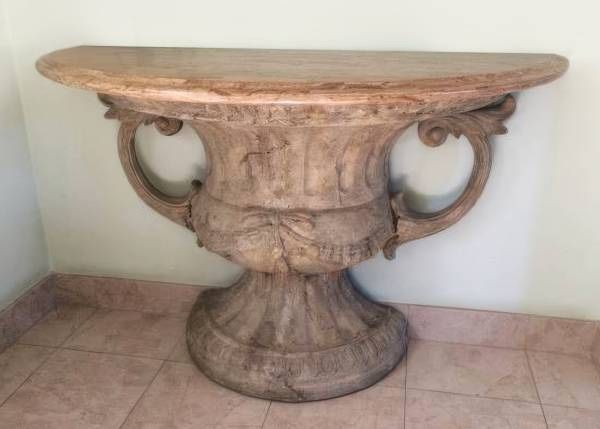 This amazing one-of-a-kind console table is truly an Old World statement piece that looks like it belongs in a European villa or classical gallery. This piece features a marble top with refined beveled edges. Please Note: I am not completely sure if it is genuine marble, or a very realistic faux marble. But it is fairly heavy and can easily pass for the real thing. The top rests on an impressively scaled base designed as a large stone urn from Greek or Roman antiquity — rich with sculptural detail and texture. The base has the look of ancient carved stone or aged pottery, with subtle variations and patina that give it authentic old-world charm. The sweeping curved handles and fluted contours add depth and visual interest, making it as much a piece of art as it is functional furniture. It is substantial and eye-catching – perfect for an entryway, hallway, or as a dramatic accent behind a sofa. Highlights: • Marble top with beveled edge detail • Large sculptural urn-style base • Faux-stone finish with antique character and texture • Solid, heavy, and very stable • Neutral tones that complement a wide range of décor styles (traditional, Mediterranean, eclectic, etc.) This is not a lightweight or flimsy piece—it has real presence and makes an immediate impression. Condition: Excellent overall with natural-looking variations in the finish that enhance its aged aesthetic. If you’re looking for a distinctive, high-end accent piece that stands apart from typical furniture store offerings, this is it. Dimensions: 48” wide x 30” high x 20” deep