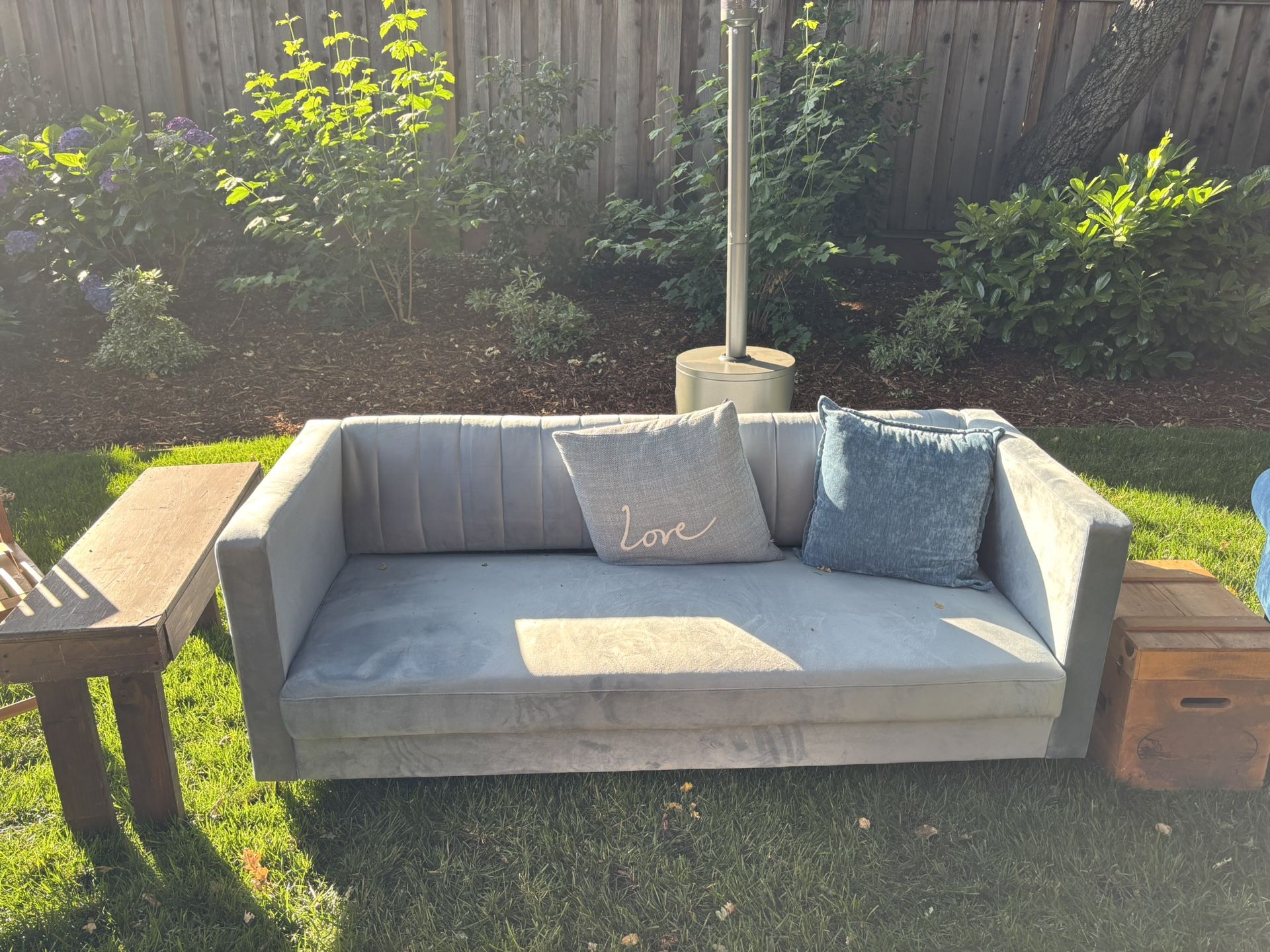 Used for 1 night only for an event and barely sat in! Perfect condition and ready for pickup in Menlo Park. Originally purchased from Wayfair, link here. The item is no longer in stock and was purchased at full price: https://offerup.com/redirect/?o=aHR0cHM6Ly93d3cud2F5ZmFpci5jb20vZnVybml0dXJlL3BkcC9ob21lLWRlc2lnbi1pbmMtd2Vpc3MtdmVsdmV0LXNxdWFyZS1hcm0tc29mYS1oZG5uMjI5NS5odG1sP3BpaWQ9OTk0MTkzMDA= Overall 29.5'' H X 74.4'' W X 31.5'' D