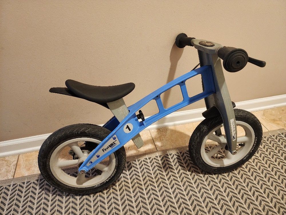 For sale excellent learning balance bike and lowering kit for kids 2 years and up.. Description from Amazon The balance bike features air tires ideal for off-road conditions with mostly grass, gravel, or loose dirt surfaces. Designed in Germany, the multi-award winning balance bike is the perfect super light training bike for developing your child's sense of balance and motor skills. Featuring advanced composite construction, a unique rear drum brake and a host of other safety features, FirstBIKE is the coolest bike on the street. It's the ideal companion for walks and discovery journeys because it's designed so young children can keep up with their parents walking speed. Children will develop an early sense of balance and control, along with independence, self-confidence and happiness - all without any need for stabilizers. Winner of toy awards across Europe, FirstBIKE, catches your eye from first sight due to its unique ergonomic design. Features & details GERMAN DESIGN AWARDED AROUND THE WORLD FOR SAFETY - child-friendly rear drum brake; horse saddle seat prevents children from slipping off; handlebar does not fully rotate and helps keep direction UNIQUE MATERIAL – lightweight, high-strength yet flexible composite frame absorbing shock and protecting a child’s spine; weatherproof balance bike with optional skis instead of wheels in winter FirstBIKE’s high-tech frame is extremely durable – it does not splinter, swell, or rust like wooden or metal frames MORE SAFETY FEATURES – no sharp edges or extruding screws; reflective stickers for better visibility; inflated top-quality Schwalbe tires absorb bumps; safety grips protect children’s little fingers One of the LIGHTEST WITH A BRAKE (8. 6 lbs/3, 9 kg); one of the LOWEST (12 in/30, 5 cm with LowKit) and HIGHEST (17. 5 in/44, 5 cm) at the same time; seat adjustable without tools; NO UPGRADES NECESSARY