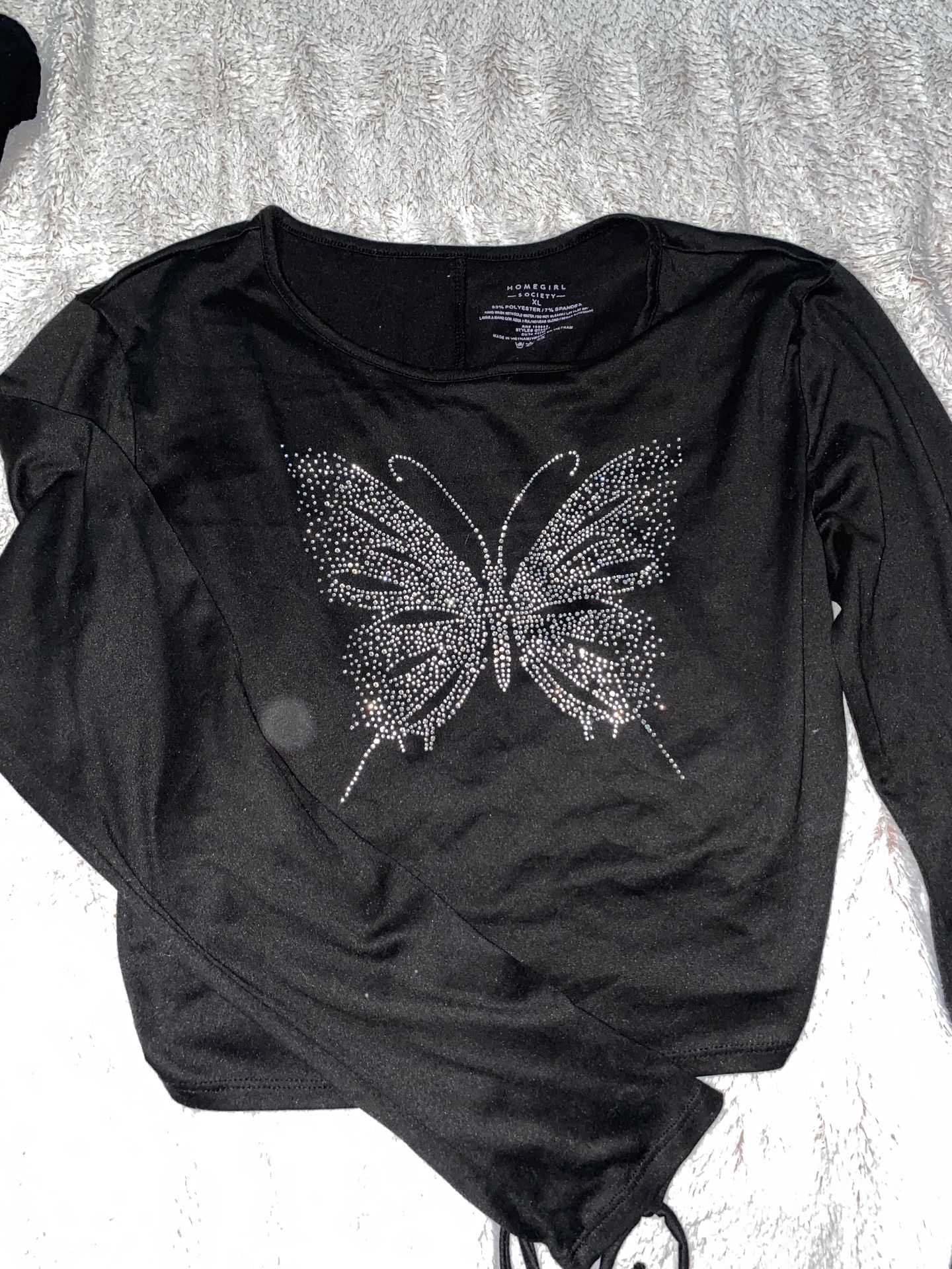 Black long sleeve top with studs all throughout the butterfly design with a cinched open back that you can tie as well. Brand: Ross Size: xl