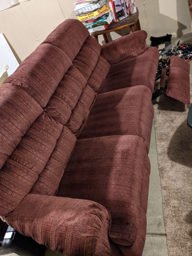 The one recliner on the couch works going up, but doesn't go all the way down. Smoke free/Pet free home.