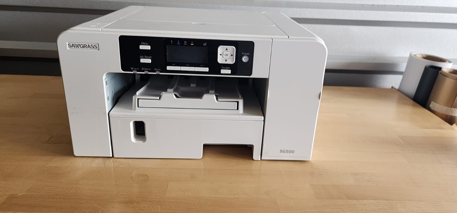 The perfect printer for the hobbyist or moonlighter, the SG500 fits comfortably on a desktop, and prints on media up to 8.5˝ x 14˝ (22 x 36 cm). This allows you to apply custom artwork to a wide variety of popular, high-margin items, from mugs and coasters to phone cases and awards. For apparel it is advised for at least 75% polyester fabric content, otherwise use of the EasySubli system is recommended. I have a lot of Sublimation blanks mugs, shirts… Ask about them for the details.
