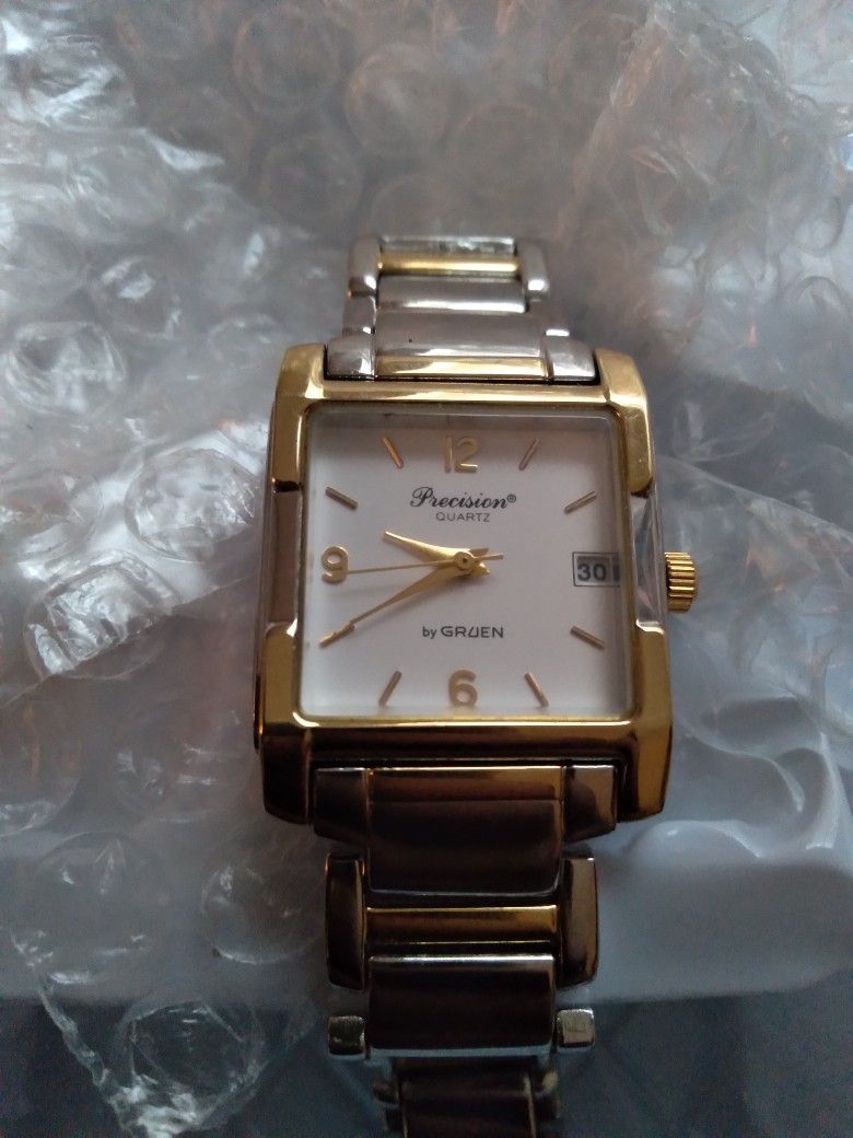 Gruen Precision Quartz wristwatch, a vintage model from the Gruen Watch Company. It features a distinctive two-tone design with a square case and an integrated metal bracelet. Tested, works great, in great condition, and includes brand new battery. Watch Details Brand: Gruen Precision Quartz Case Shape: Square Movement: Quartz (battery-operated) Case & Band Material: Likely stainless steel back with a base metal bezel/accents (gold and silver tone) Dial: White with gold-tone Arabic numerals and stick indices; a date window is present at the 3 o'clock position Estimated Era: These specific models