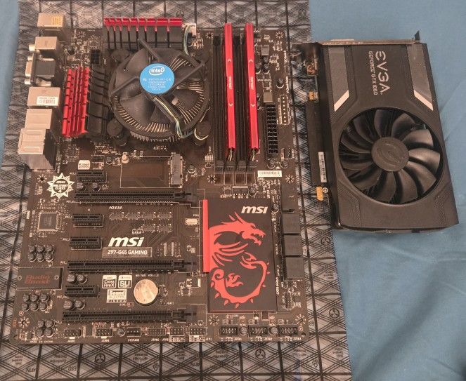 Selling a Motherboard, Cpu, Cooler, Ram, Gpu. Everything still works great, I just tested it out. All you need to complete this is a pc case with a psu and ssd. Msi Z97-G45 Gaming Motherboard Intel i5-4690 3.5GHz Cpu Intel Cpu cooler 16GB Patriot Viper DDR3 Ram EVGA GTX1060 3G Gpu This will be a good budget 1080 setup for Esports titles like Valorant, CS2, Roblox, etc. $120 See less