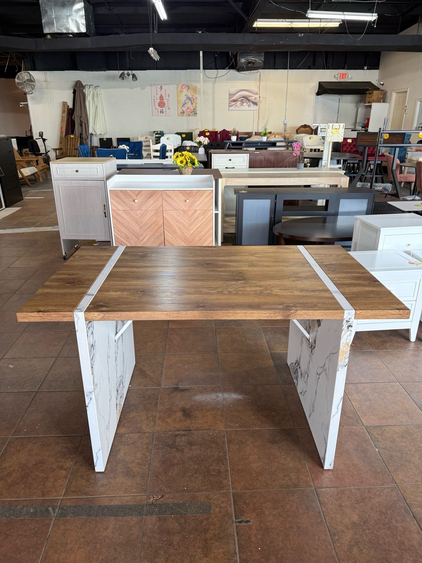 Natural Wood Grain MDF Dining Table, Wood Textured Desktop, White Marble Patterned Table Legs, 55"x31.5 π°180$