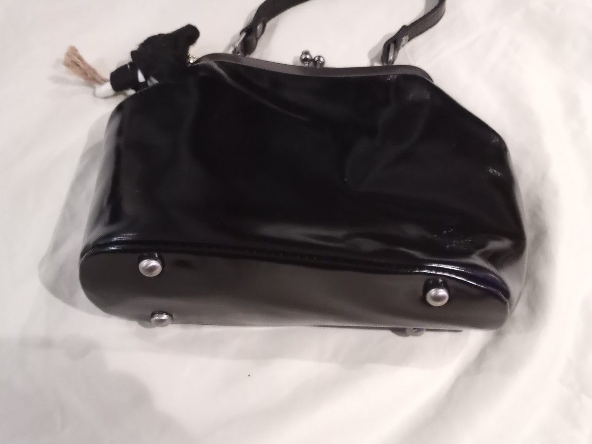 Patricia Nash Purse black shiny leather with a twist snap top. Purse has original bag and authentication card with it. Nice present without breaking the bank.