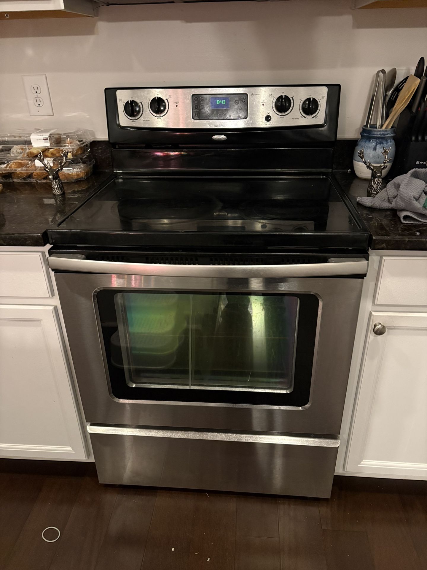 Functioning stove top with 4 burners, two burners have dual setting. Functioning oven with two wire racks