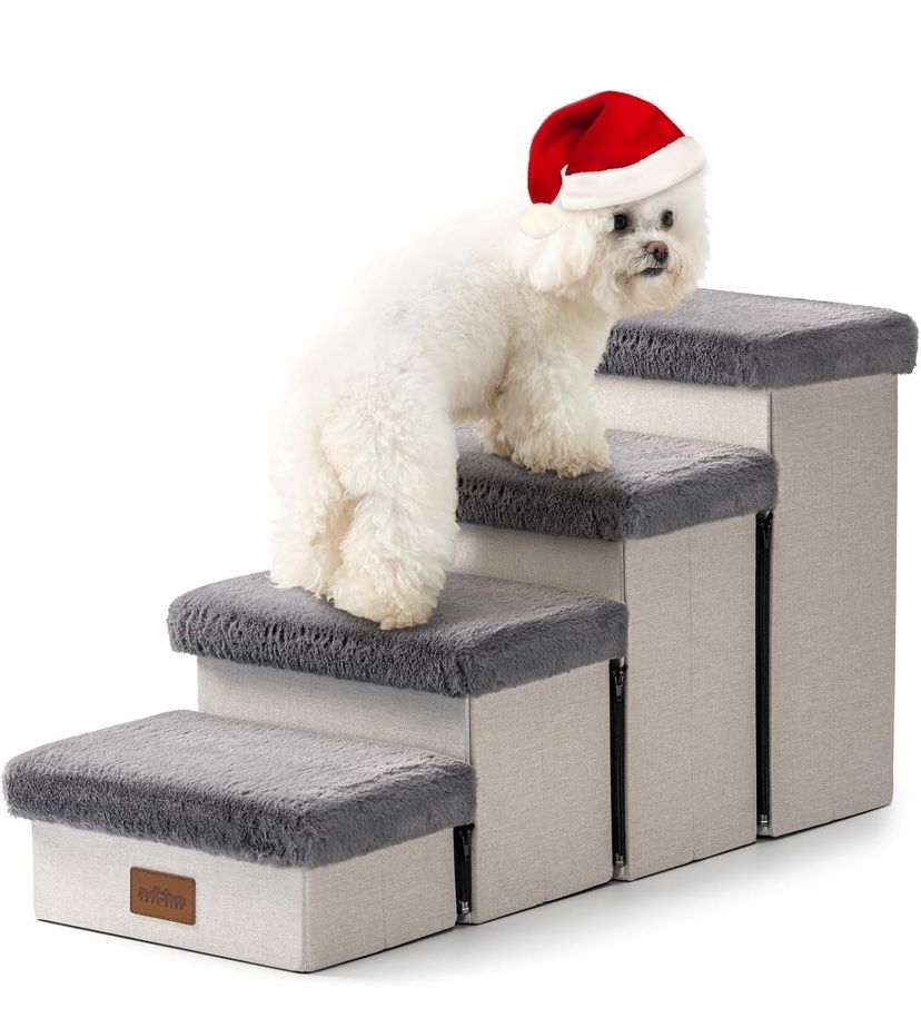 Dog Stair for Small Dogs with Storage, Foldable Pet Step with Soft Cover, Older Cat Ramp for Chair Couch Sofa, Lightweight, Durable, Comfort, 33x13x17.7 inch, 4 Tiers Grey