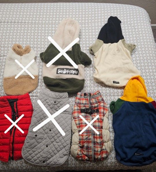 CYBER WEEK DEAL!!! have a new smaller dog and he can't fit the items my previous bigger dog wore. These will fit medium to large dog. You're welcome to bring your dog to try before you buy π Hoodies- $8 Small Pj-$5 All cleaned and as fur free as I could get'em.