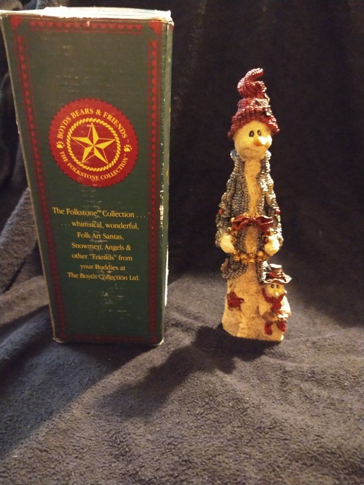 Style #2812 Jingles and Son with Wreath. 1994. Snowman holding a wreath with son. Measures 7 3/4" tall and base is 2" wide. $10.00