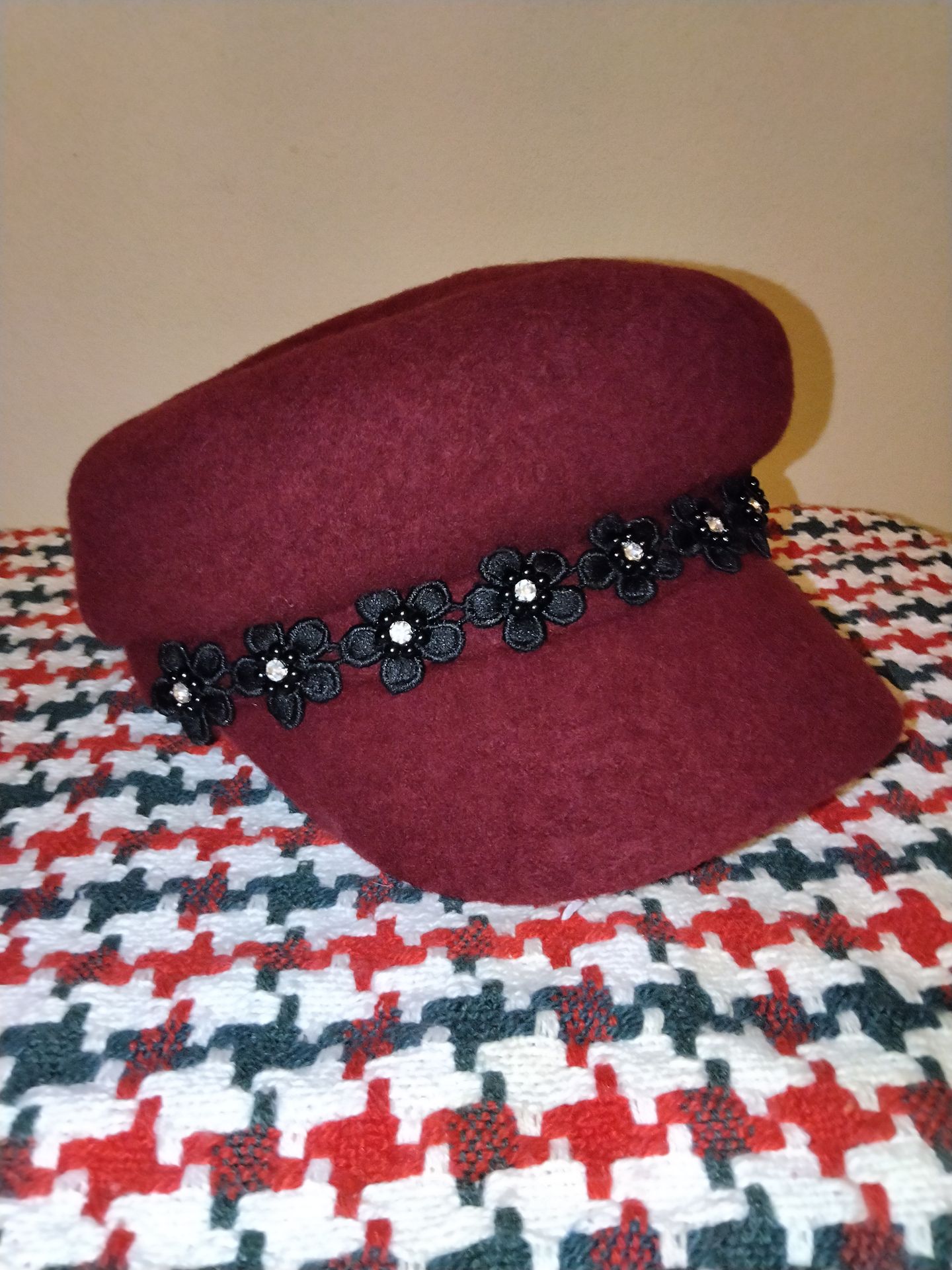 Female headwear Burgundy Newsboy Hat Black Daises on Brim Material: 100% wool Dry Clean Only One Size Fits All The Hat has not been used, the package has been opened. ***No Refund Local Pickup Only Cash Only ~~~~~~~~~~~~ Gorro de mujer Gorro de Lana burdeos Margaritas negras en el ala del Gorro Sólo limpieza en seco Talla única Gorro nunca se ha usado, pero el paquete ha sido abierto. ***Sin Reembolso Solo Recogida Local Solamente Dinero Efectivo
