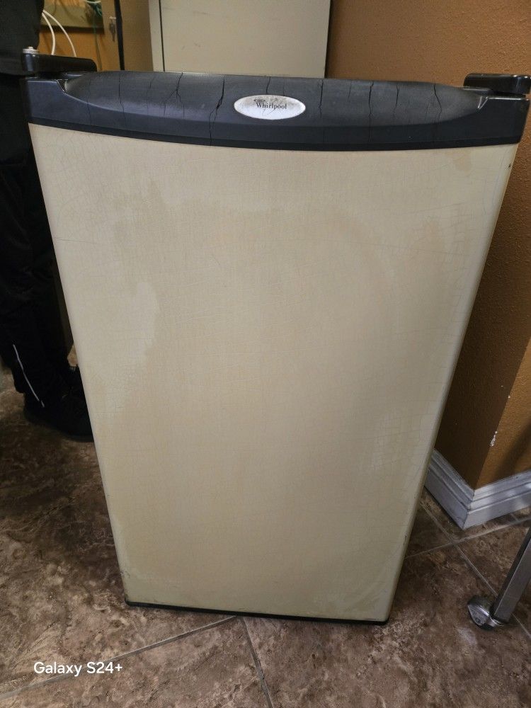 Whirlpool mini fridge. Well used in an office setting, but is still in working order and could be perfect for a garage.