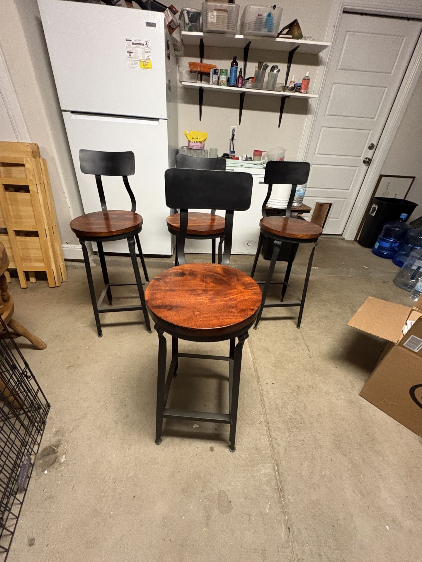 $250 OBO Authentic Nadeau (Furniture with a Soul) bar stools. Solid wood seats with black metal base. Sturdy and heavy — not the lightweight box-store kind. Seat height: 28.5” Back height: 41.5” Seat diameter: 15” Excellent condition. Sold as a set of 4. Pickup in Kyle.