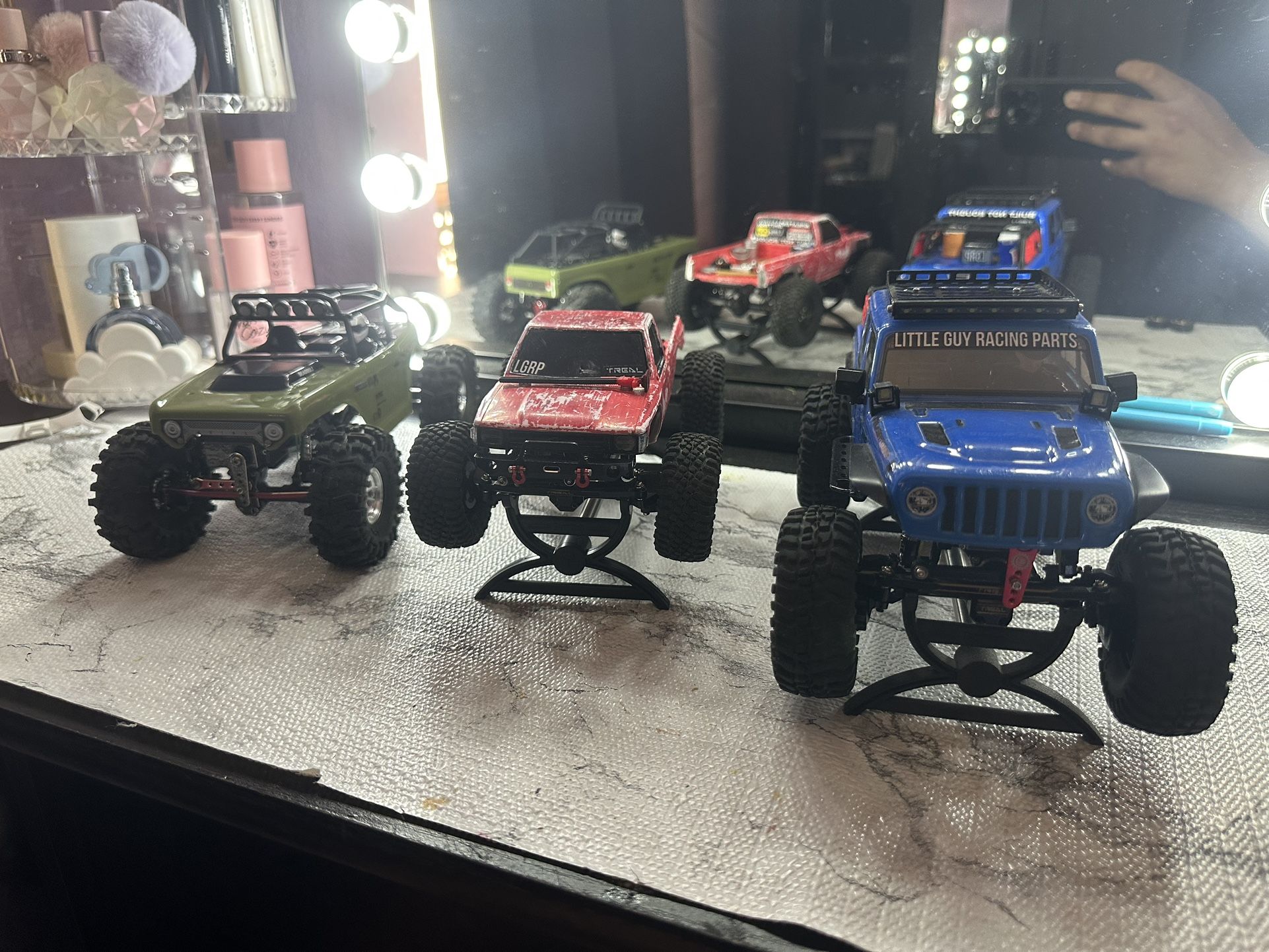 For sale 3 scx24 all fully upgraded with almost nothing stock left on them -Deadbolt $350 -Toyota $550 -Gladiator $400 -Deadbolt is gladiator length with Injora lcg frame, 43mm treal shocks in the rear and Hot racing stock length in the front, +4mm injora axles front and back, brass treal rear link mount, brass servo mount with a Nano m shift rc servo and servo horn, injora high clearance links, injora drive shafts, aluminum injora skid plate, injora metal gear transmission and injora motor, treal brass steering knuckles, rc4wd bead lock wheels and little guys racing swamp king tires -Toyota is deadbolt length with stock frame, hot racing internal spring shocks, ramp crab axles with brass steering knuckles and crazy steering angle, +5mm treal brass wheel weights all around , treal brass rear link mount, treal brass servo mount, emax servo with treal servo horn , treal brass steering links, treal high clearance links, treal brass boulder bars, Furitek transmission brushless komodo motor and esc, treal transmission housing, treal brass bead lock wheels with BFGoodrich tires -Gladiator with stock frame, injora rock sliders, treal 43mm shocks in the rear, hot racing shocks in the front, treal portal axles front and rear, hot racing aluminum rear link mount, OGRC brass servo mount with OGRC servo and servo horn, treal brass steering links, injora high clearance links, injora drive shafts, treal transmission housing, injora motor, Amazon light kits, injora bead lock wheels with little guy racing trail king tires Price is for all three, not firm on price. Shoot my an offer cash only. No trades