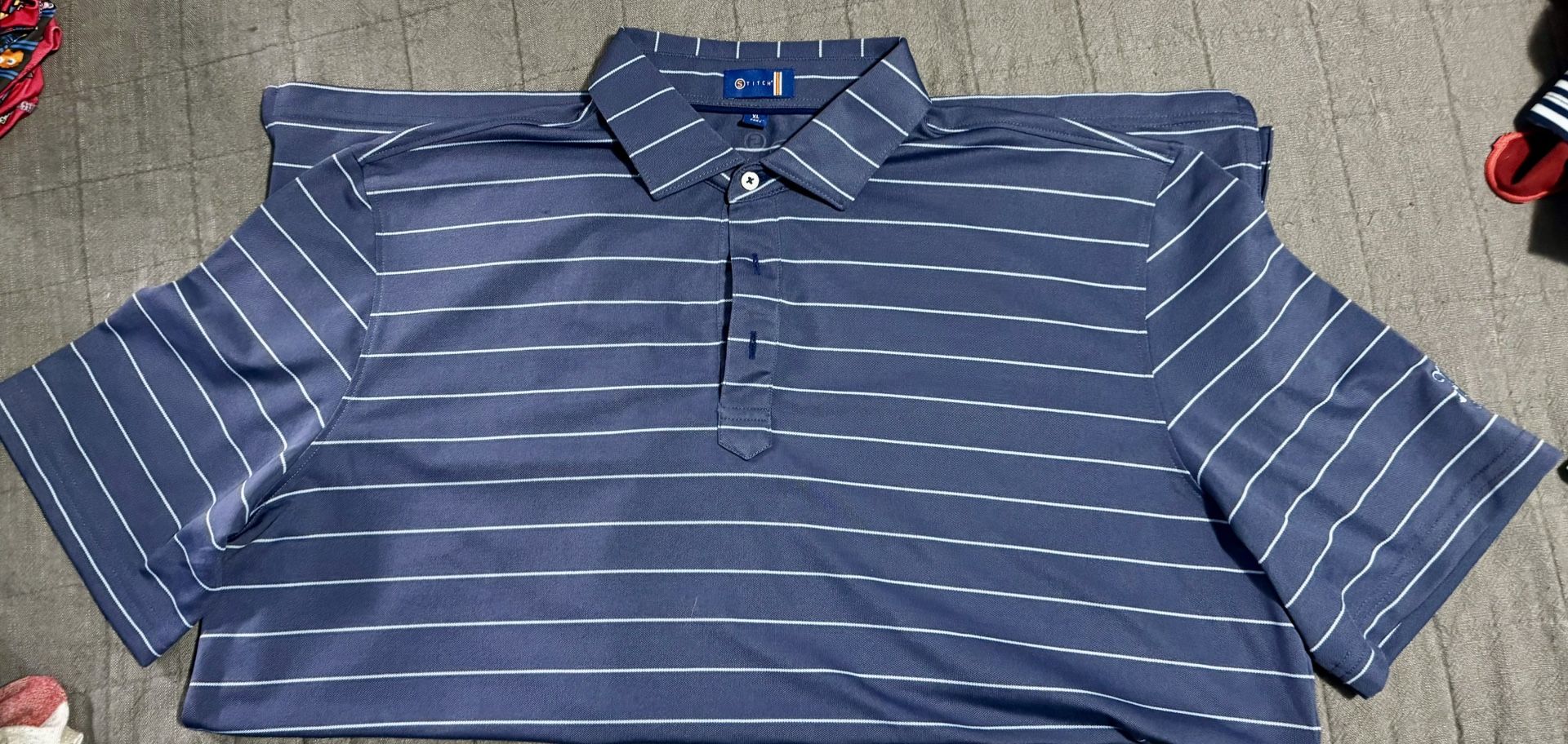 Men’s Stitch XL. Stylish navy polo with white stripes. Comfortable and versatile. Ideal for casual outings. Like new!