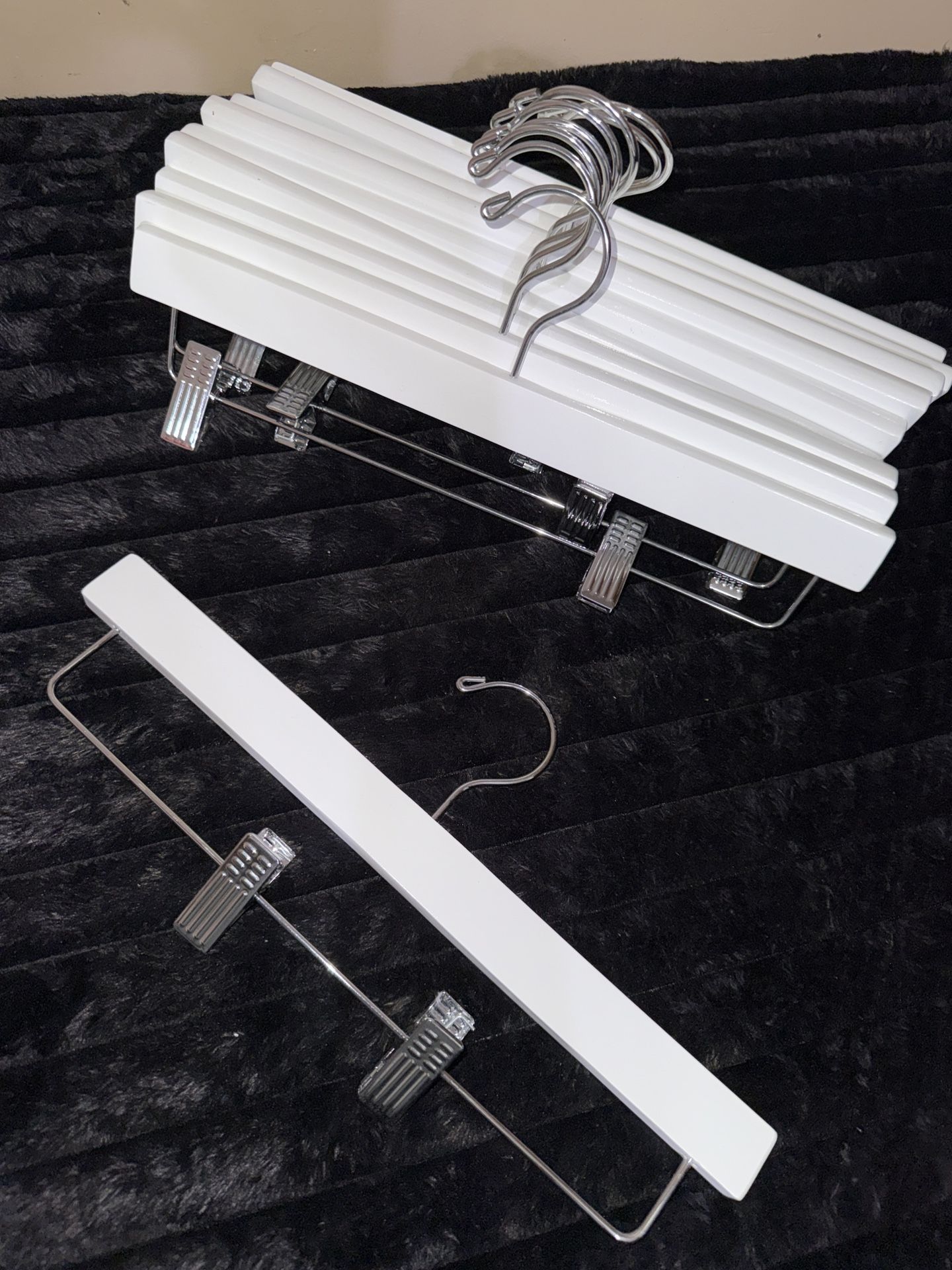 10 Pcs white wooden pants and skirt hangers with chrome clips.
