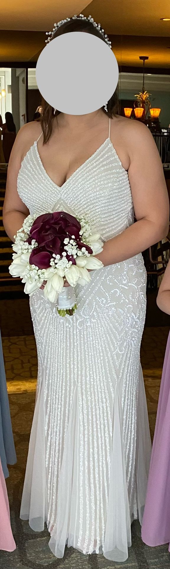 DB Studio Beaded Sheath Bridal Gown. Like new - Only worn for a 2-hour reception. ltered hem to fit a 5’2” bride with 3” heels. Fits curves perfectly and it will be great for beach, country, outdoors or simply elegant wedding themes. Size 10. Original price $500. Vestido de novia marca DB Studio. Como nuevo - Solo usado por 2 horas. El vestido se ajusta a todo tipo de silueta y hace lucir y resaltar las curvas. Todo el vestido tiene detalles bordados con cuentas/canutillo. El largo fue ajustado para una novia de 1.60 metros con tacones de 8cm. Talla 10. Precio original $500.