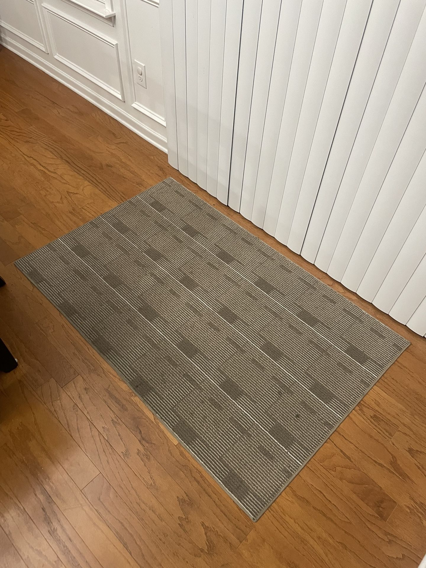 In good condition. The color is more grey, but slight hint of beige. Almost 3 feet x 5 feet. Measurements are in the pictures.