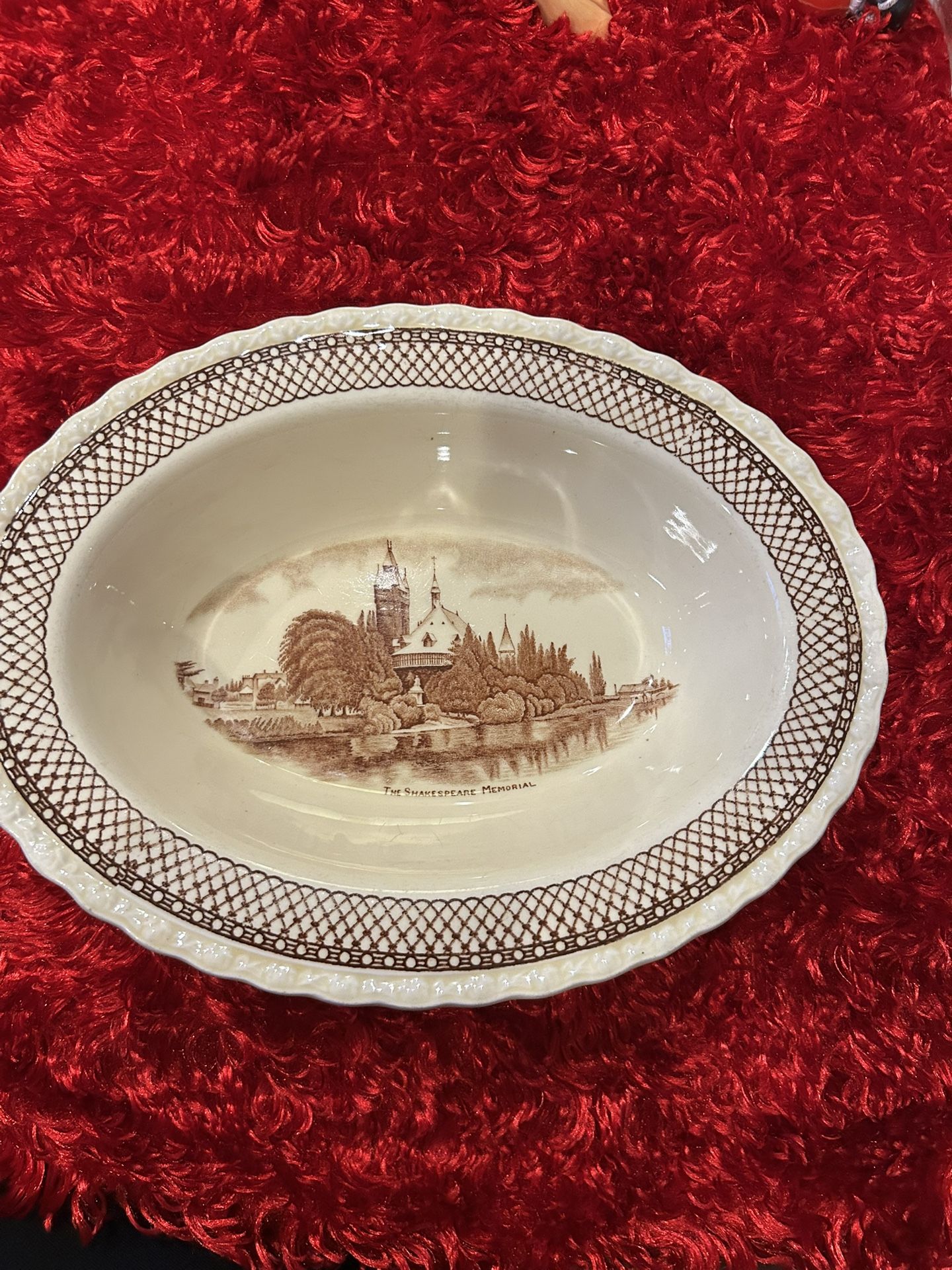 Probably 1930’s. Staffordshire pottery . The 8 1/2” oval dish is centered with an image of the Shakespeare memorial. What a great treasure to add to your colt
