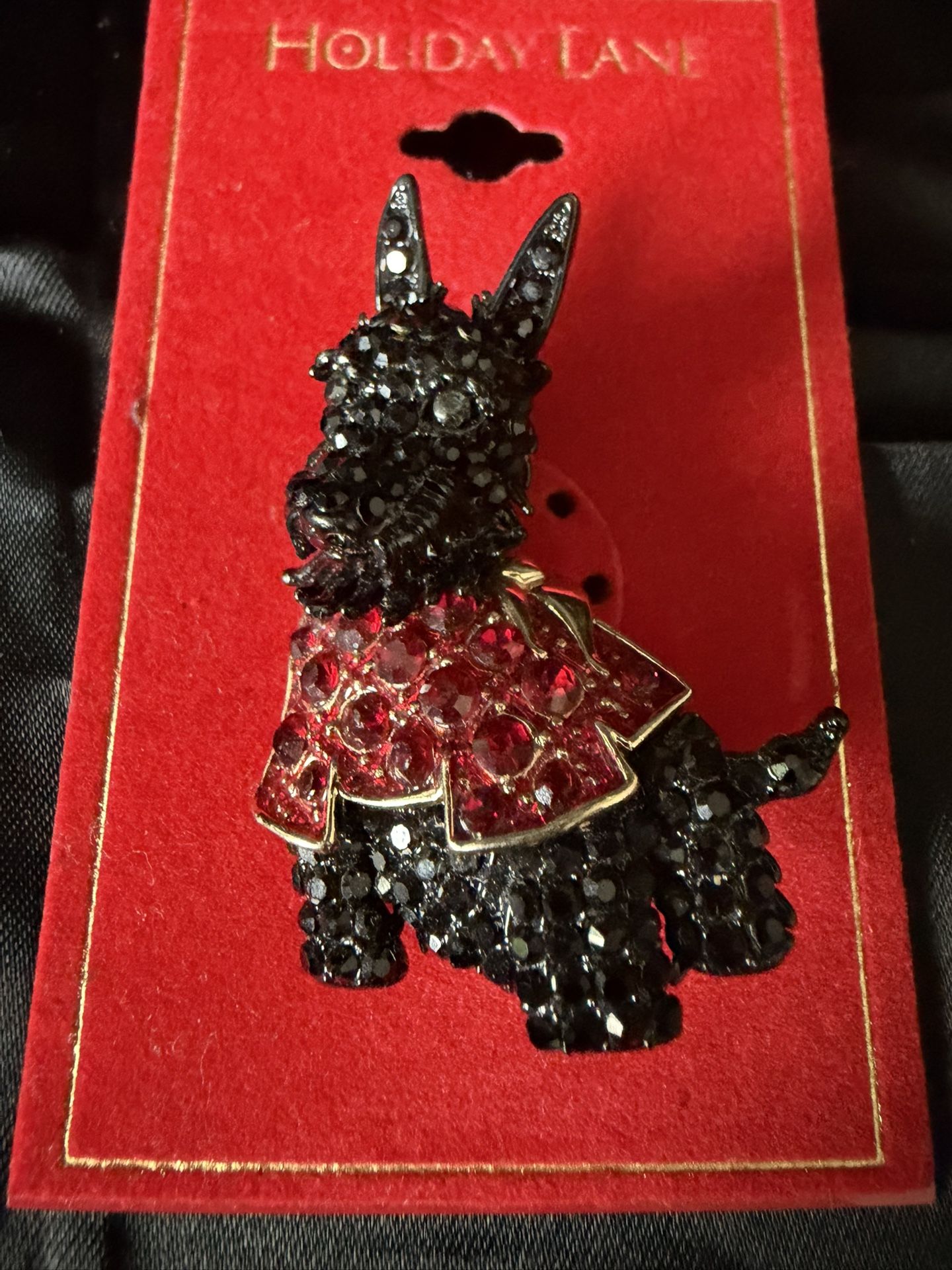 Adorable Scottish Terrier Holiday & Every Day Pin. Black & Red Stones. B-8