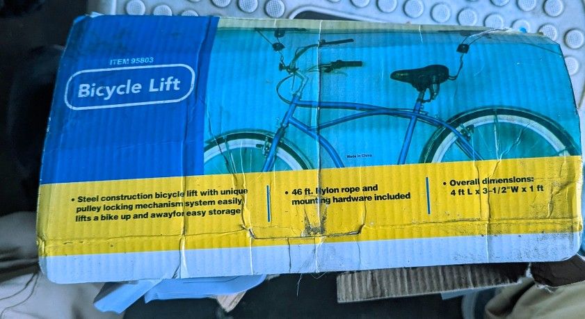 New bicycle lift in original packaging. The packaging is not very good but it is a complete assembly