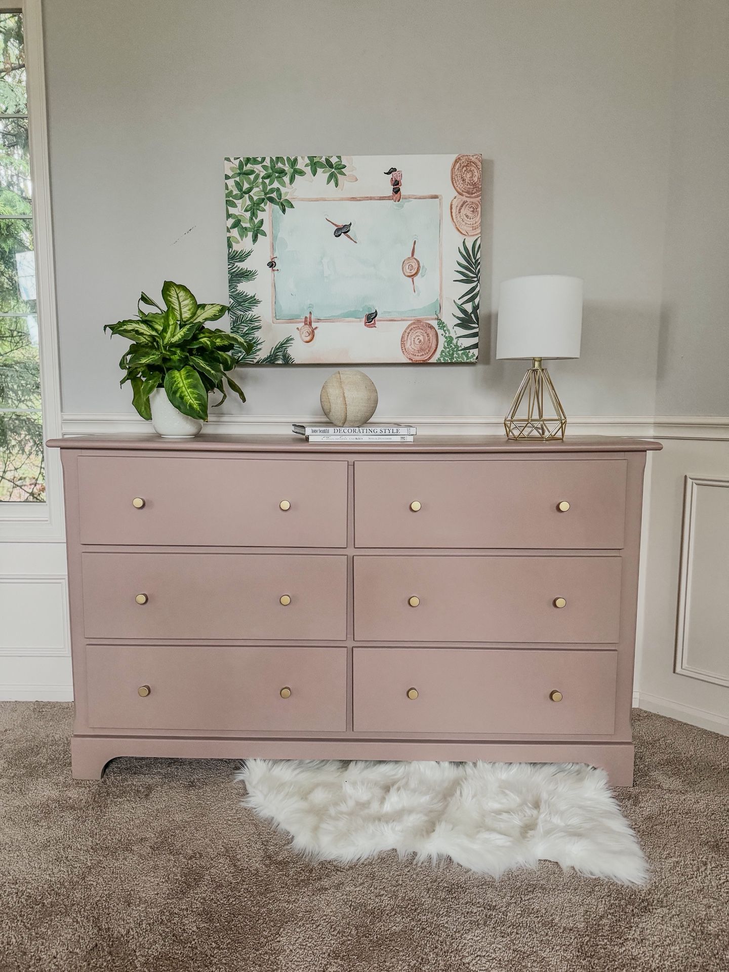 Newly refinished 6-drawer dresser. This piece spray painted with a beautiful dusty pink color and sealed with multiple coats polycrylic for protection. It features 6 drawers with wooden tracks that slide smoothly. The brass hardware is new. Liners were also added. *Nightstand available in another listing* Dimensions: 55.75’’ wide x 17’’ deep x 33’’ high. Delivery available for a fee. See my other listings. Instagram: @olivetreegarage