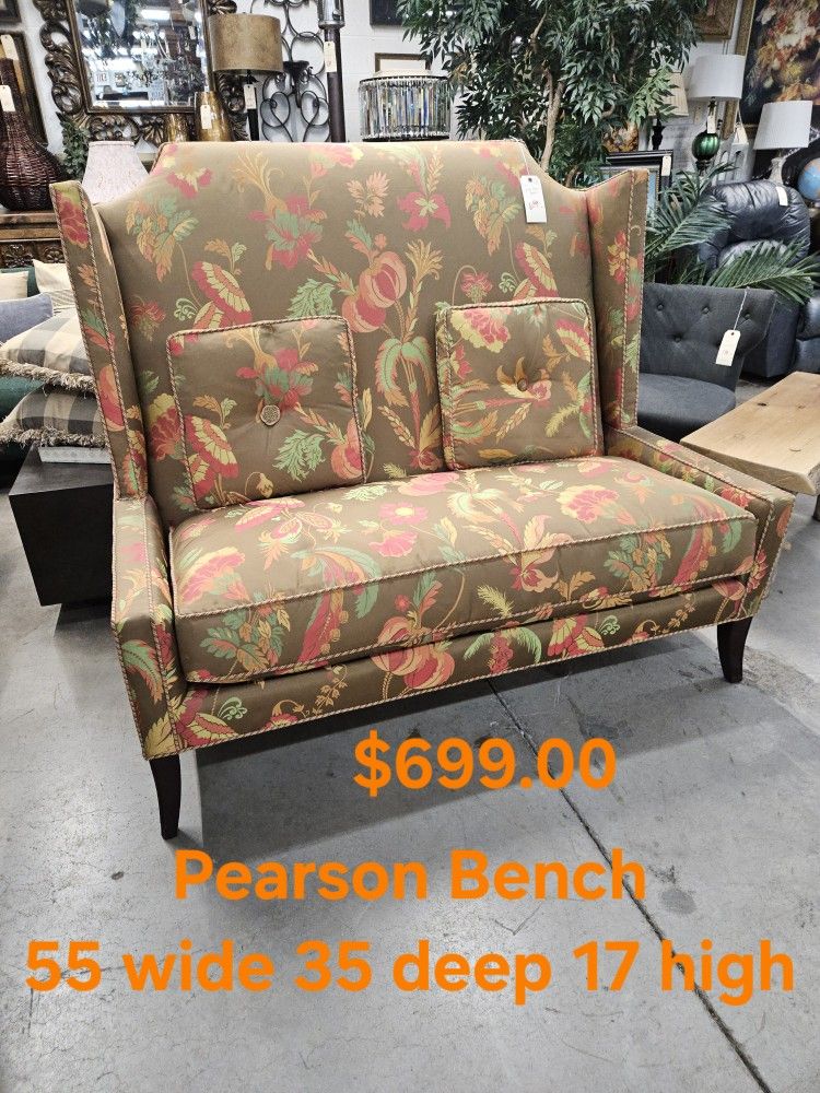 Beautiful Fabric Bench Made by Pearson Located at 2811 E. Bell Rd. Southside at the stoplight on Bell Rd. & 28th street Another Time Around Furniture aka Eclectica Home Furniture. We are open Wednesday through Monday 10 to 5 We are closed on Tuesdays Ask for Stephanie or Aaron. See our other items here also. We have 4 American flags on our front patio to help you find us, see the picture here. Follow us here and see all of the items in the store