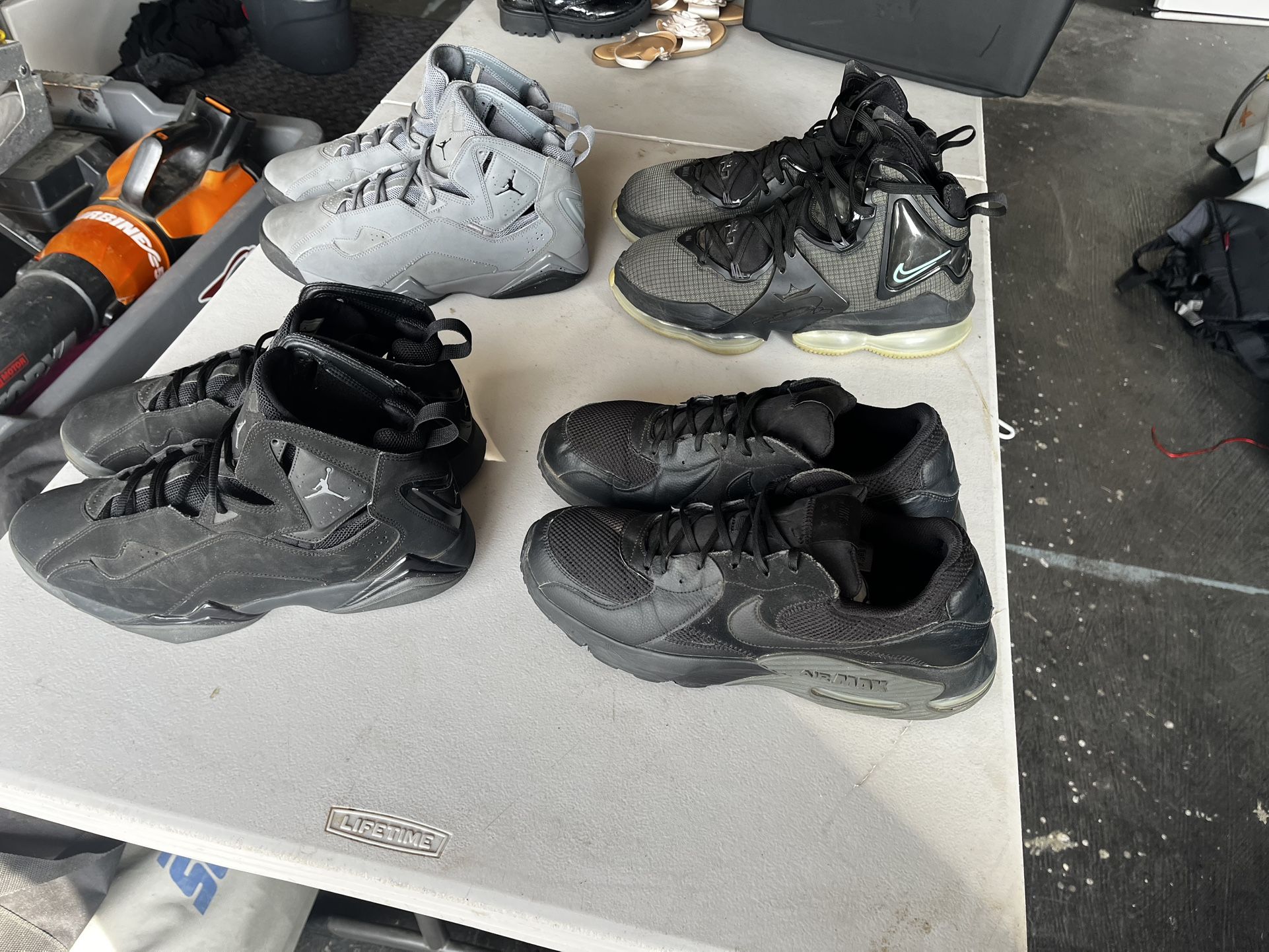 All Men’s size 13 shoes all in good condition may just need light cleaning because they have been in storage box for a while. * Jordan true flight cool gray $50 * Jordan true flight black & dark gray $50 * nike LeBron 19 back and green $70 * Nike air max excee black & dark gray $40 Take all for $160