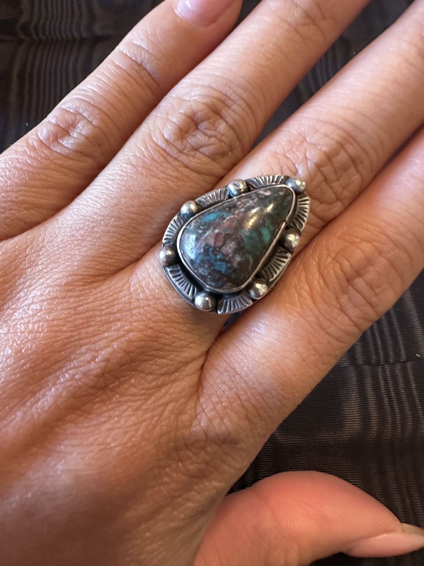 Handcrafted sterling silver ring with a unique teardrop-shaped turquoise stone and stamped detailing around the bezel. Beautiful mix of earthy blues and browns in the stone. Marked 925 (genuine sterling silver). Size 8.5. Southwestern or boho vibe—perfect for stacking or wearing as a bold solo piece. Available for local pickup in the Whittier area. Price: $99 OBO