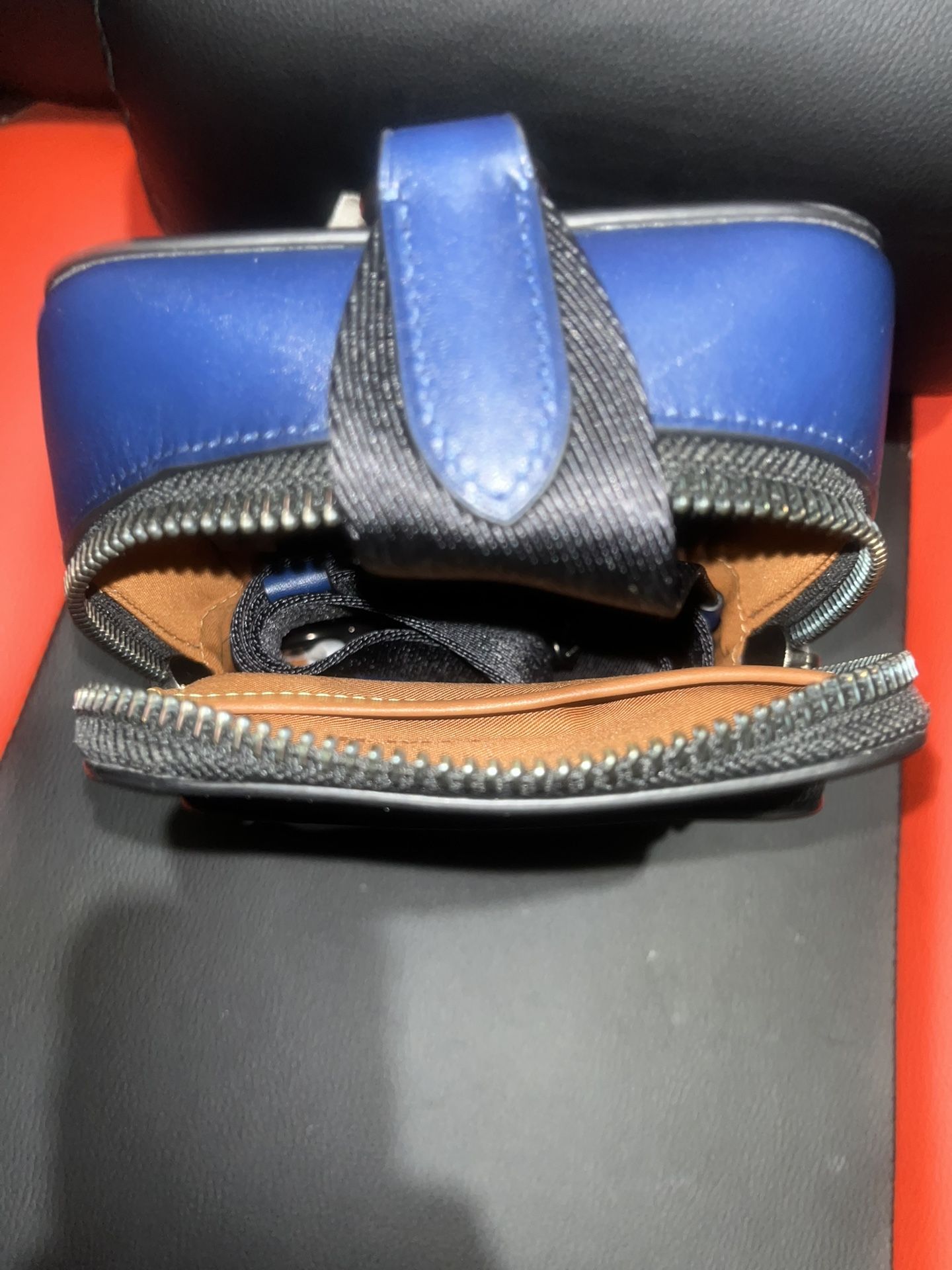 COACH Gotham Sling Pack 13 in Burnished Leather- Blue The bag has a zipper closure with one external zipper pocket and two internal open compartments. It comes with a dust bag for additional storage space and a single adjustable strap for versatile crossbody carry. Leather construction. Brand logo embossed at the front. Textile lining.