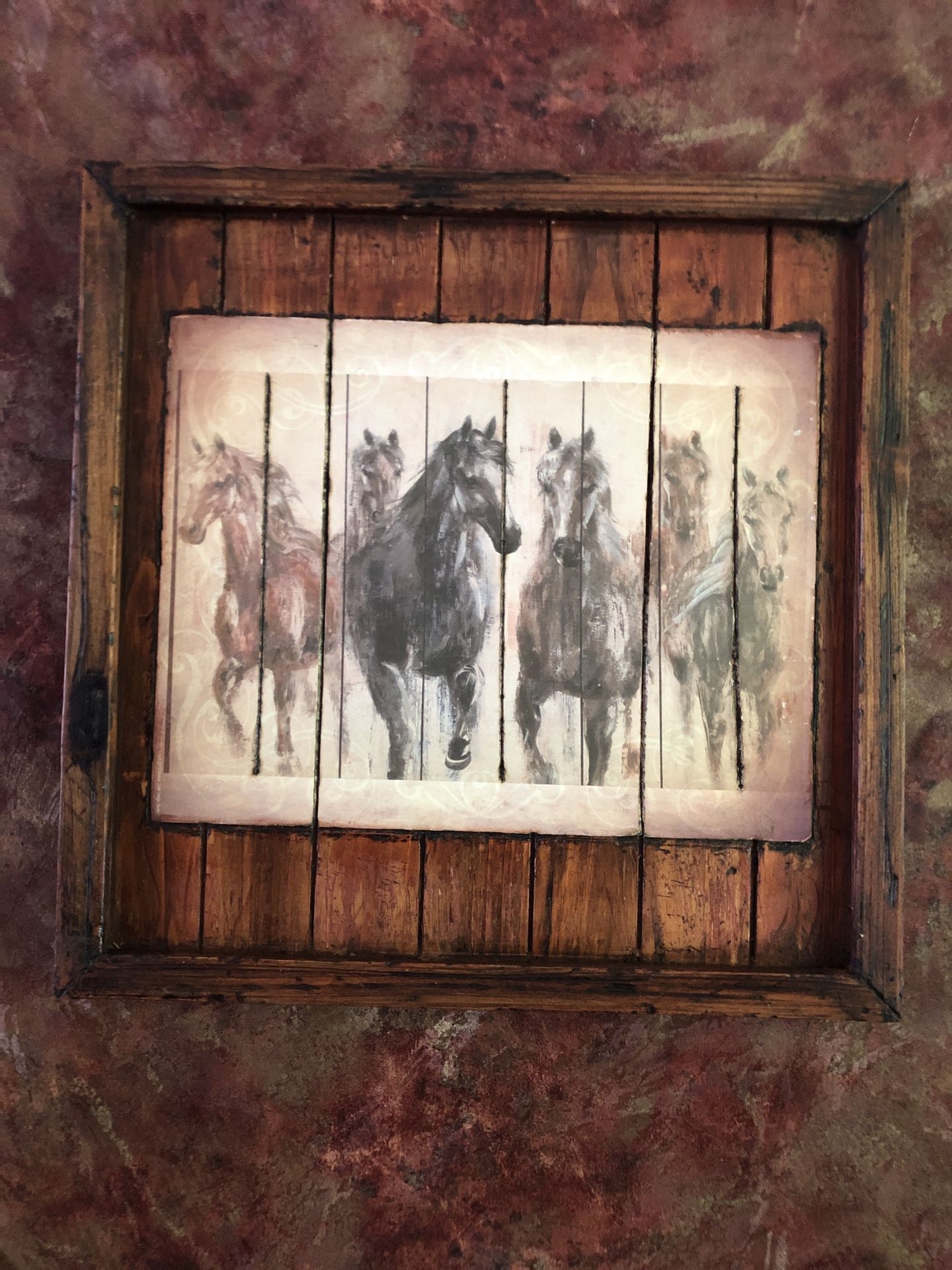 Beautiful print Of horses galloping transferred onto wooden plank board Hand stained and designed