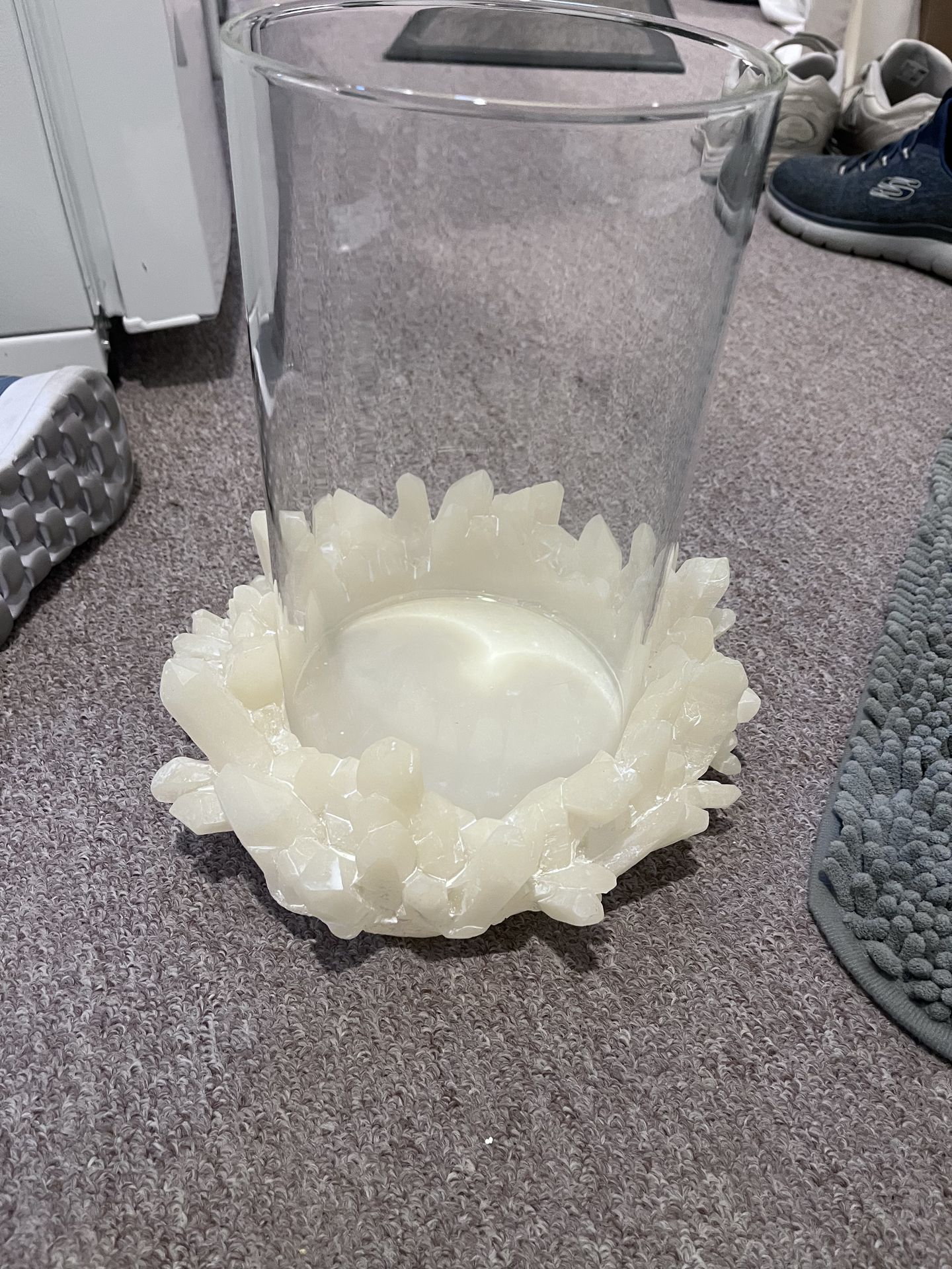Beatiful statement hurricane candle holder featuring a clear glass cylinder and a crystal-inspired geode base. Measures approximately 11 inches tall. Perfect for glam, modern, or luxury home decor