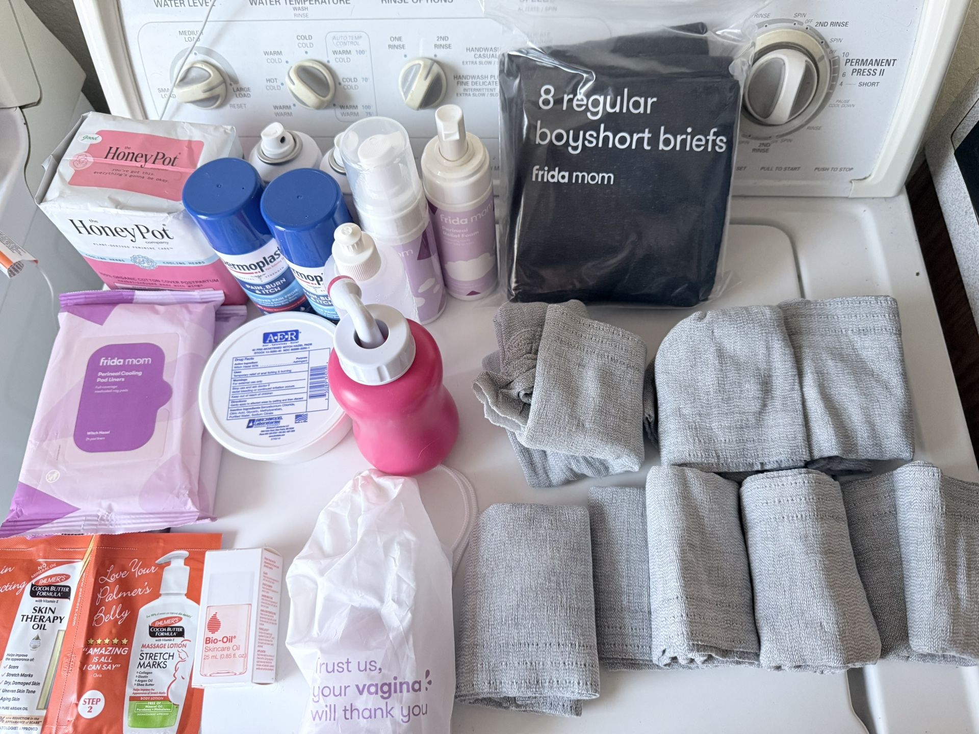 Large postpartum care bundle with many unused or lightly used items. Perfect for recovery after birth or to help a new mom prepare without paying full price. Includes: • NEW - Frida Mom 8 regular boyshort briefs (new in package) $10 • NEW - Honey Pot Postpartum Pads (box) $10 • NEW - 2 Frida Mom Perineal Cooling Pad Liners $15 • NEW 2 Cans / USED 2 Cans - Dermoplast Pain Relief Spray (4 cans) $15 • NEW - 2 Frida Mom Perineal Healing Foam $15 • NEW - Frida Mom Peri Bottle $5 • USED - AER Witch Hazel Pads $2 • NEW - Multiple peri spray bottles $5 • NEW - Friday Mom Gray Disposable Postpartum Underwear $10 • NEW - Palmer’s Skin Therapy Oil sample $2 • NEW - Palmer’s Stretch Mark Lotion sample $2 • NEW - 2 Bio-Oil skincare oil $10 Everything Together: $70 OBO