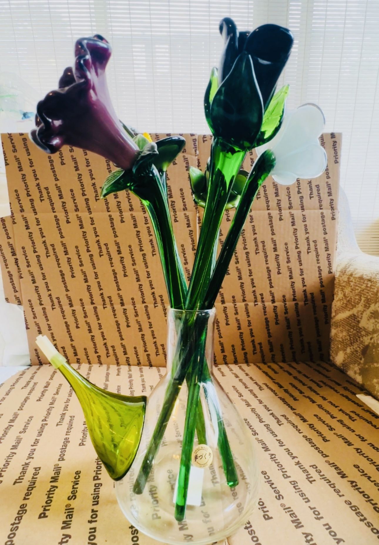 Hand-blown glass flowers and a vase can make a beautiful decorative piece. The varying sizes of the flowers, ranging from 11 to 12 inches . Open to reason Offers and Pick up North Stockton or can Drop off .