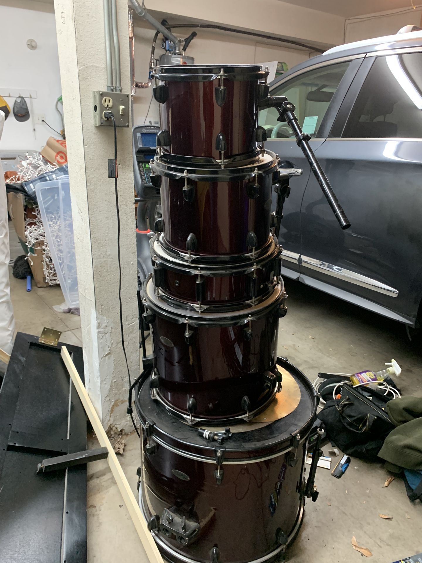 Drum set kit with seat. Missing screws for high hat piece. Kit is currently unassembled.