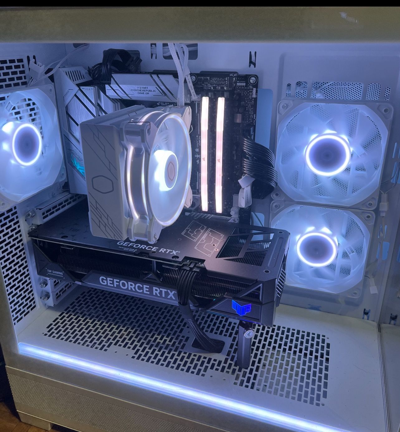 Everything was bought brand new and Built march 2025 Parts list: Gpu: asus tuf 4070ti CPU: ryzen 7800x3D CPU cooler: cooler master hyper 212 Ram: Corsair rgb 32gb 6400MHz Psu: msi 850w gold rated Motherboard: B650-A ROG STRIX WiFi Storage: 1 tb m.2 & 1tb sata, both high speed Operating system: windows 11 Case: phanteks XT view Can play any game in 4k high settings with 120fps+. 1080p fps avg is 260-480+. Perfect for anyone looking to have a top of the line gaming pc. Comes with a areox 3 wired mouse still brand new in the box and a keyboard I have a Msi 32in 1080p 144hz monitor I’ll sell with it for an extra $150 Don’t have much time to game anymore so I’m looking to sell send offers Willing to trade for a rocket 650cc+g