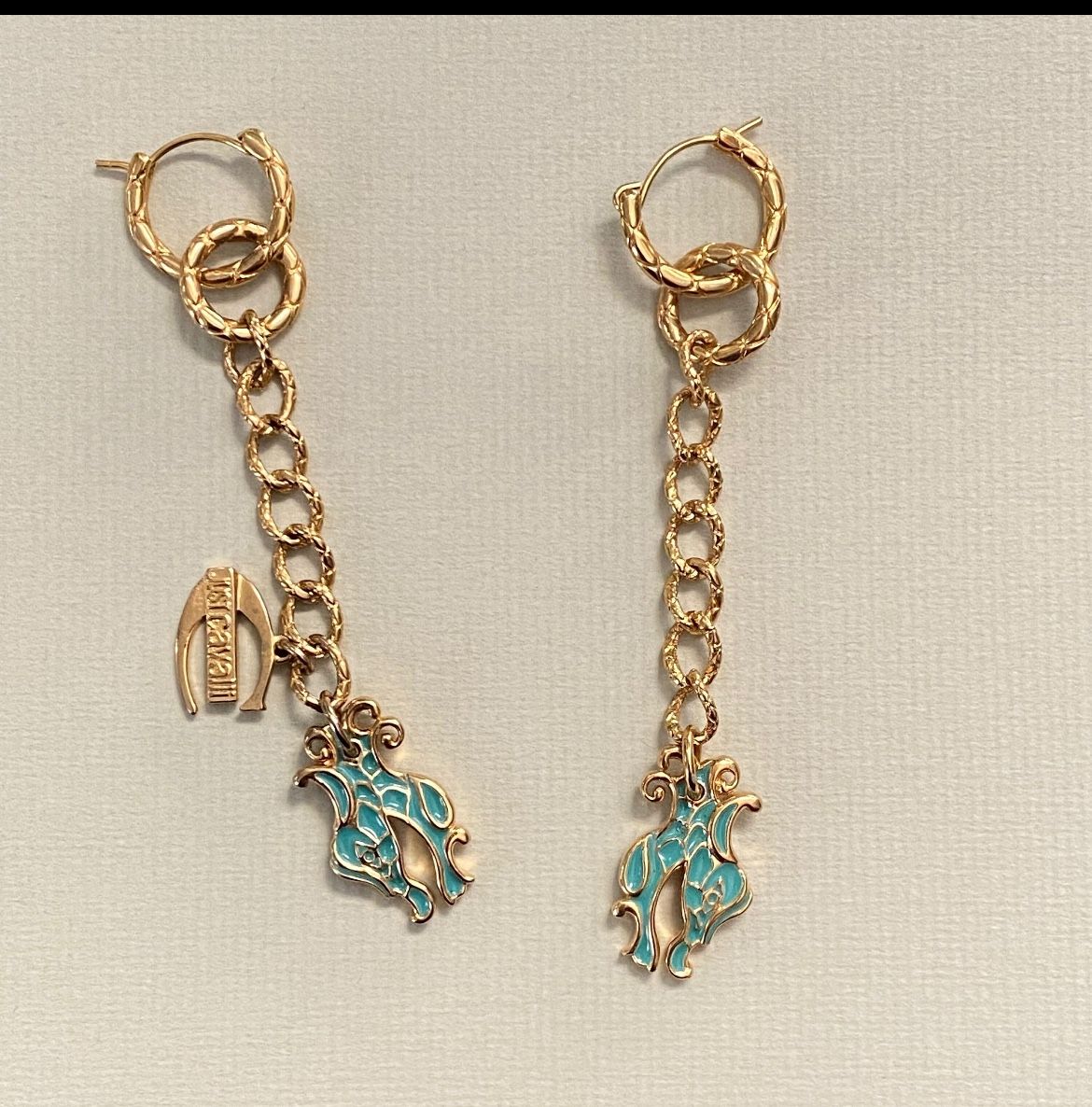 Whimsical earrings by the Italian designer Roberto Cavalli. Nicely gold plated and enamelled. In the Chinese tradition, the dragon symbolizes supernatural power, wisdom, strength, and hidden knowledge.