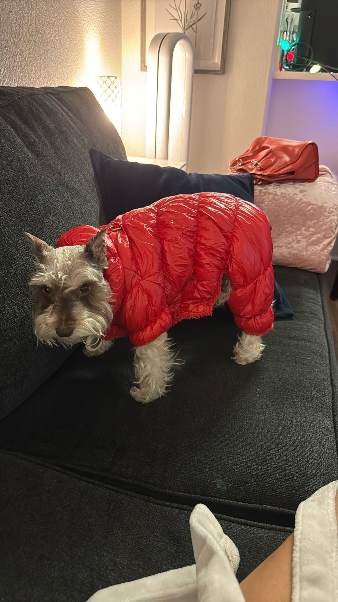 The pictures of my dog are to show you what this puffer jacket looks like on a dog. The latest photos are of the product for sale. Great for ski vacations and very cold weather!