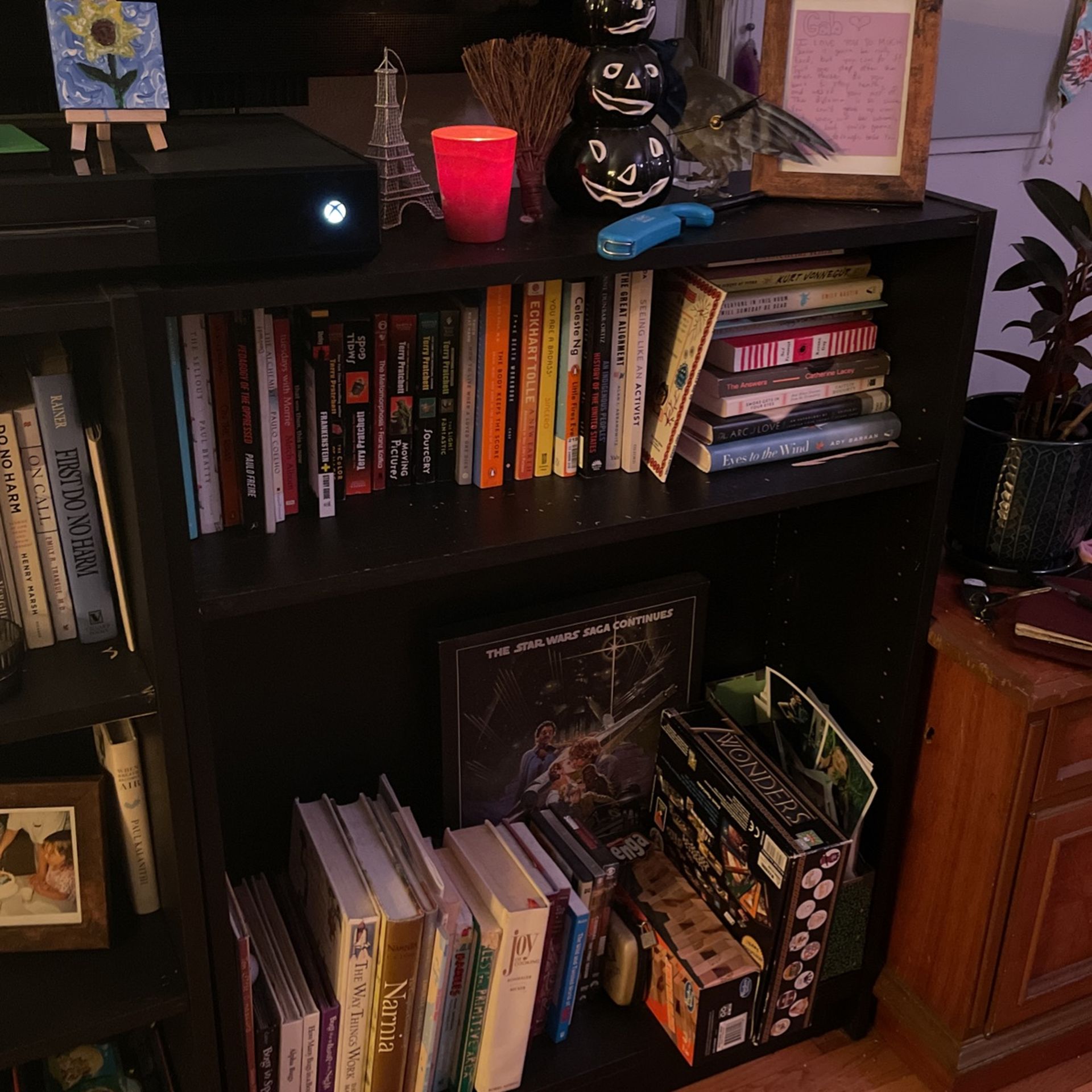 Black bookshelf (set next to another piece of furniture currently hence the weird cropping). Painting on the bottom is a bit imperfect