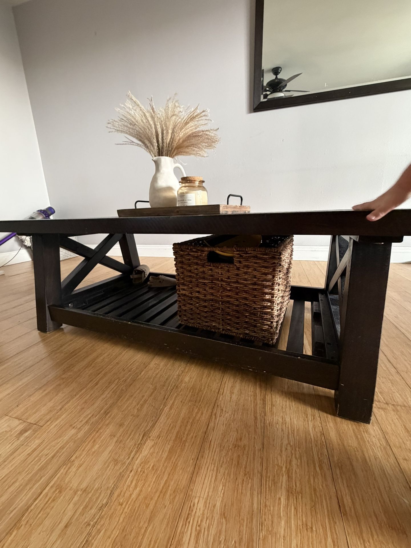 Beautiful solid wood coffee table in a dark espresso finish. Very sturdy and heavy — not MDF or flimsy. Clean farmhouse / modern rustic style that works perfectly with neutral, organic, or modern decor. Features a spacious lower shelf that’s great for baskets, books, or storage. Overall in good condition with normal wear consistent with use (see photos). No structural issues. Selling because we’re switching to a travertine stone table — this one deserves a new home. Pickup only. Cash or Zelle preferred.
