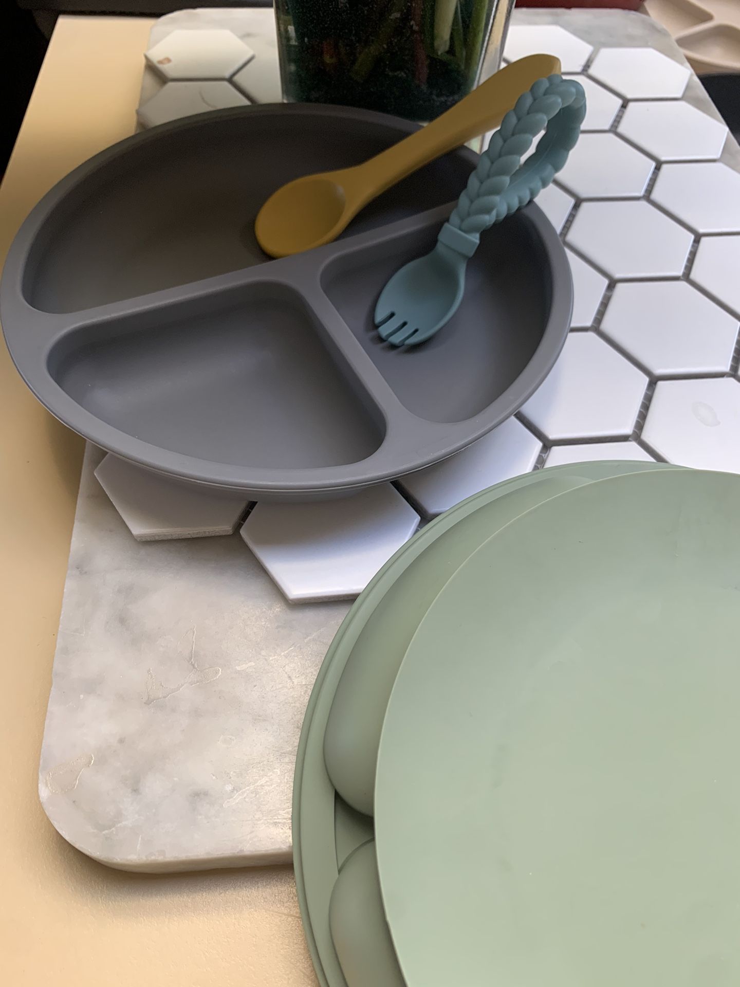 silicone baby ( one suction & one regular) with plates, spoon & a fork. new!
