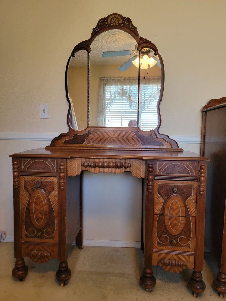Absolutely stunning Art Deco Waterfall style bedroom set from the 30s. Chest of drawers, vanity and mirror, full sized headboard and footboard (tho we used the headboard for a queen bed) Small chip on headboard in photo)