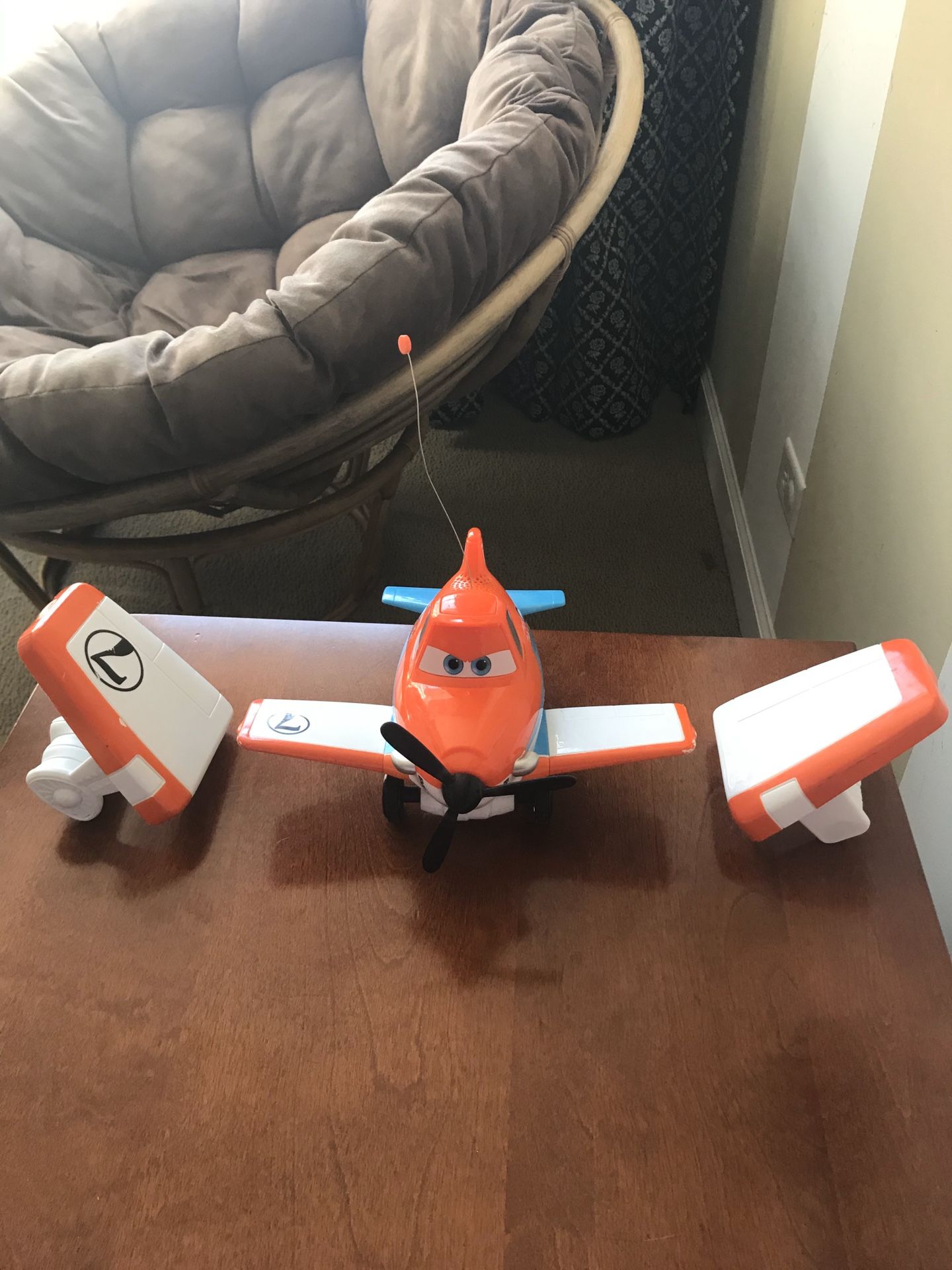 Gently used. This toy does not fly. It only runs on the ground using wheels. It is remote controlled, and the “wing” controller is used to steer by tilting left or right. Requires batteries. Feel free to ask me any questions!