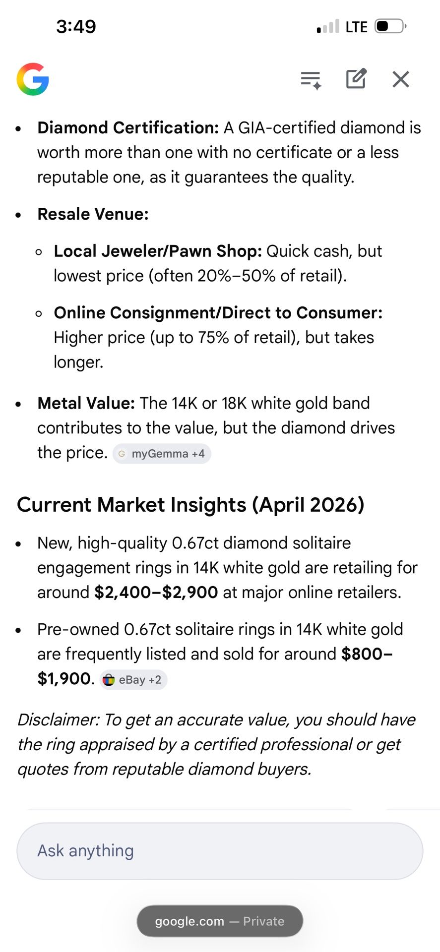S1 diamond just shy of 1 karat white gold. Retail is 1900 to 3000. Used 800 to 1500. A steal for your lady at 750. Not stolen!! Bought at Heidelberg diamonds in Plainfield Indiana 10 years ago