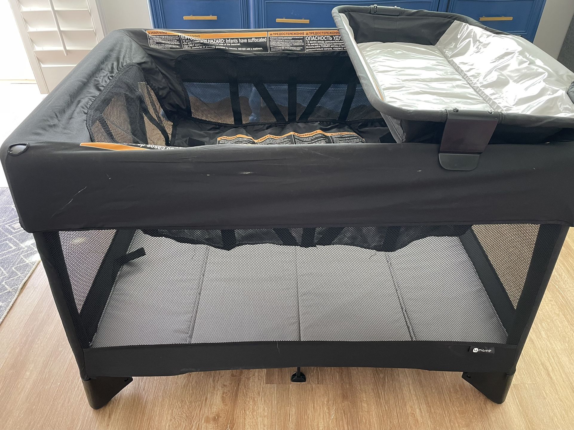 4 moms breeze plus portable 3 in 1 playpen with removable bassinet and changing table. Carrying bag included. Easy setup and breakdown