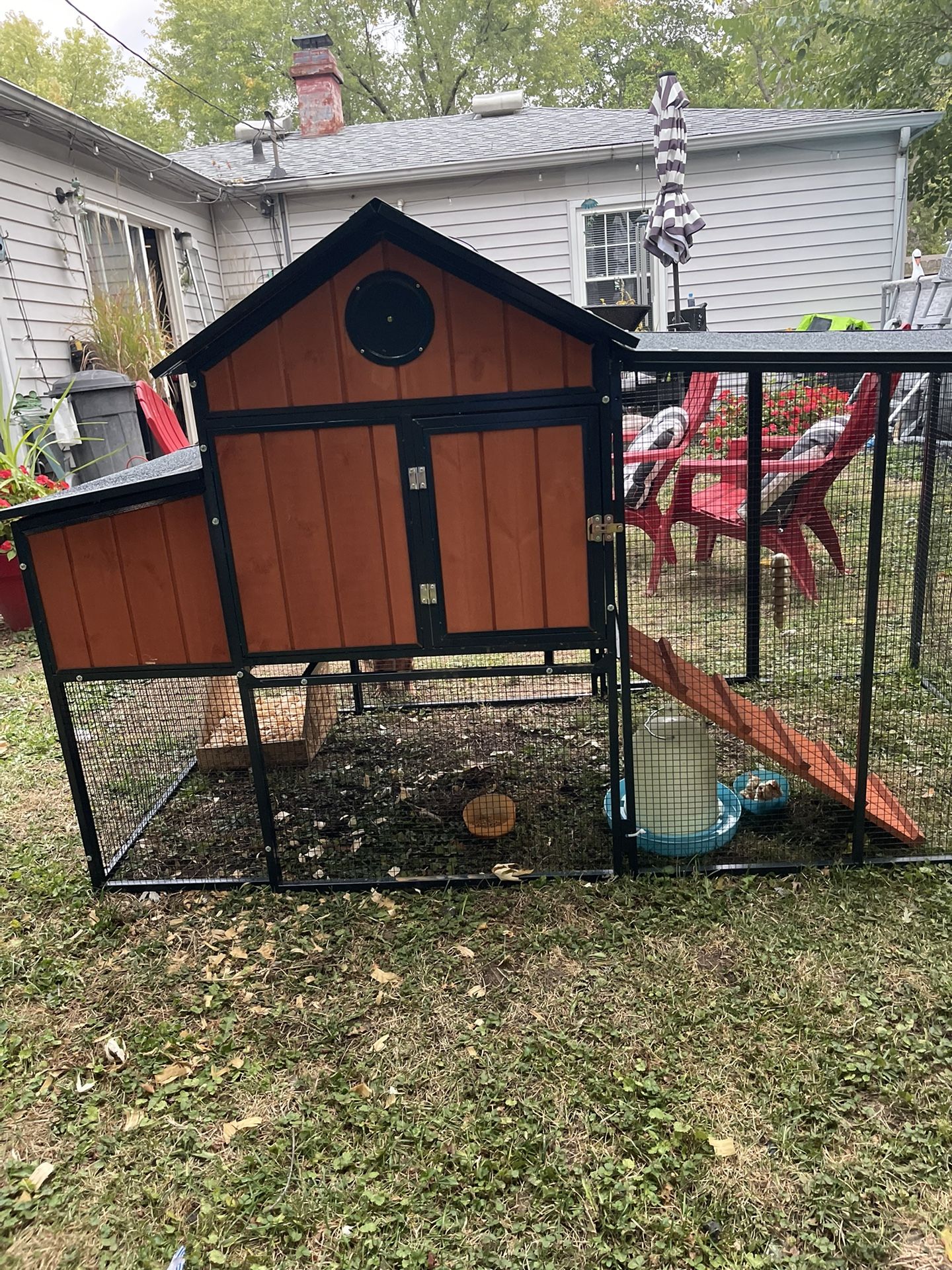 New/used I’ve only have had the coop for 2 months with winter time coming I want Ms. Ruby to be warm and taken care of the coop comes with Ms.Ruby food, treats, bedding water feeder and 2 chicken starter kit . You must pick up no assembly required. It comes with locks very nice. It sells at tractor supplies for like 450.00