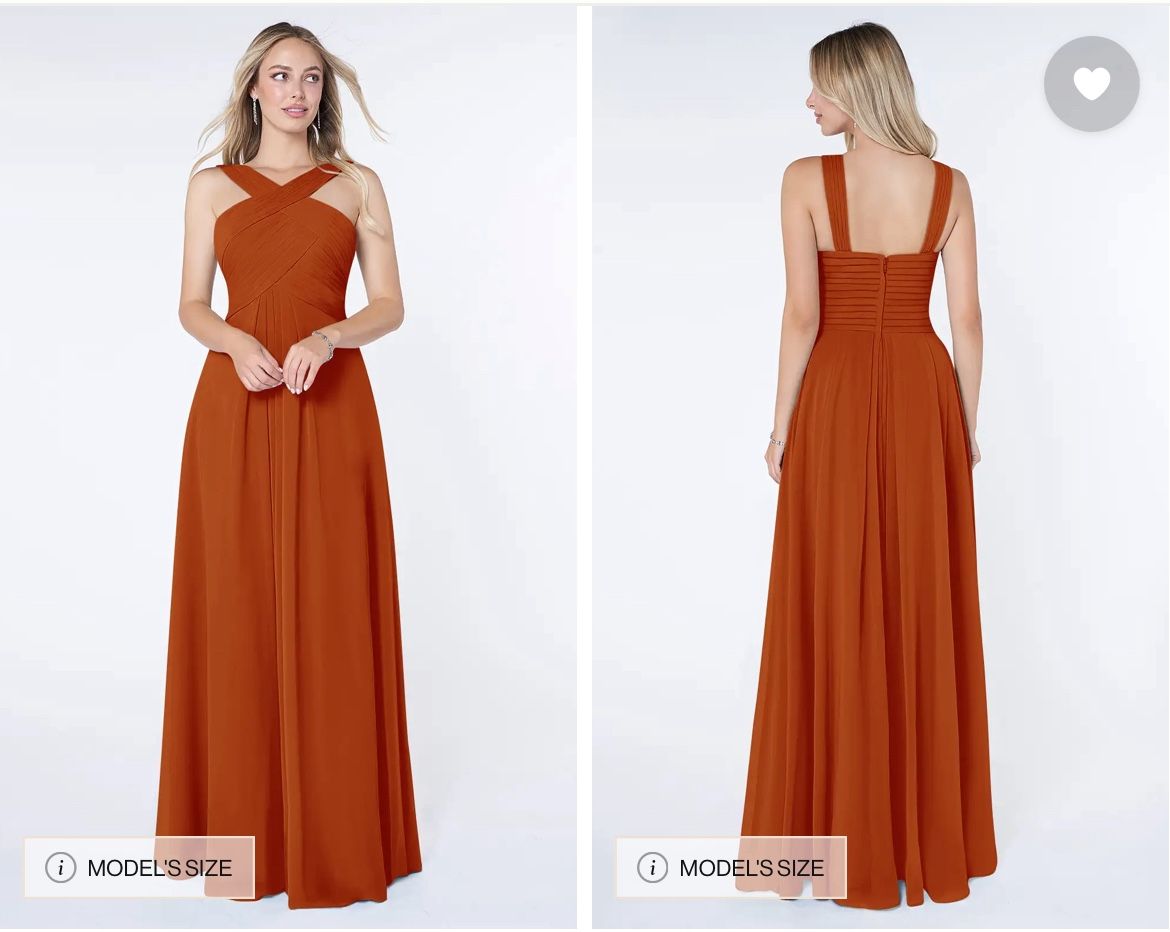 Excellent condition, freshly dry cleaned Flaws are minimal and pictured—unnoticeable run and small rip on hem Floor length A-Line Pleated Chiffon Dress Size: A4 Style: Kaleigh in paprika Originally $162 Bust: 32” Waist: 29” Hips: 38” Length: 60” Wore 3.5” heels in picture of self