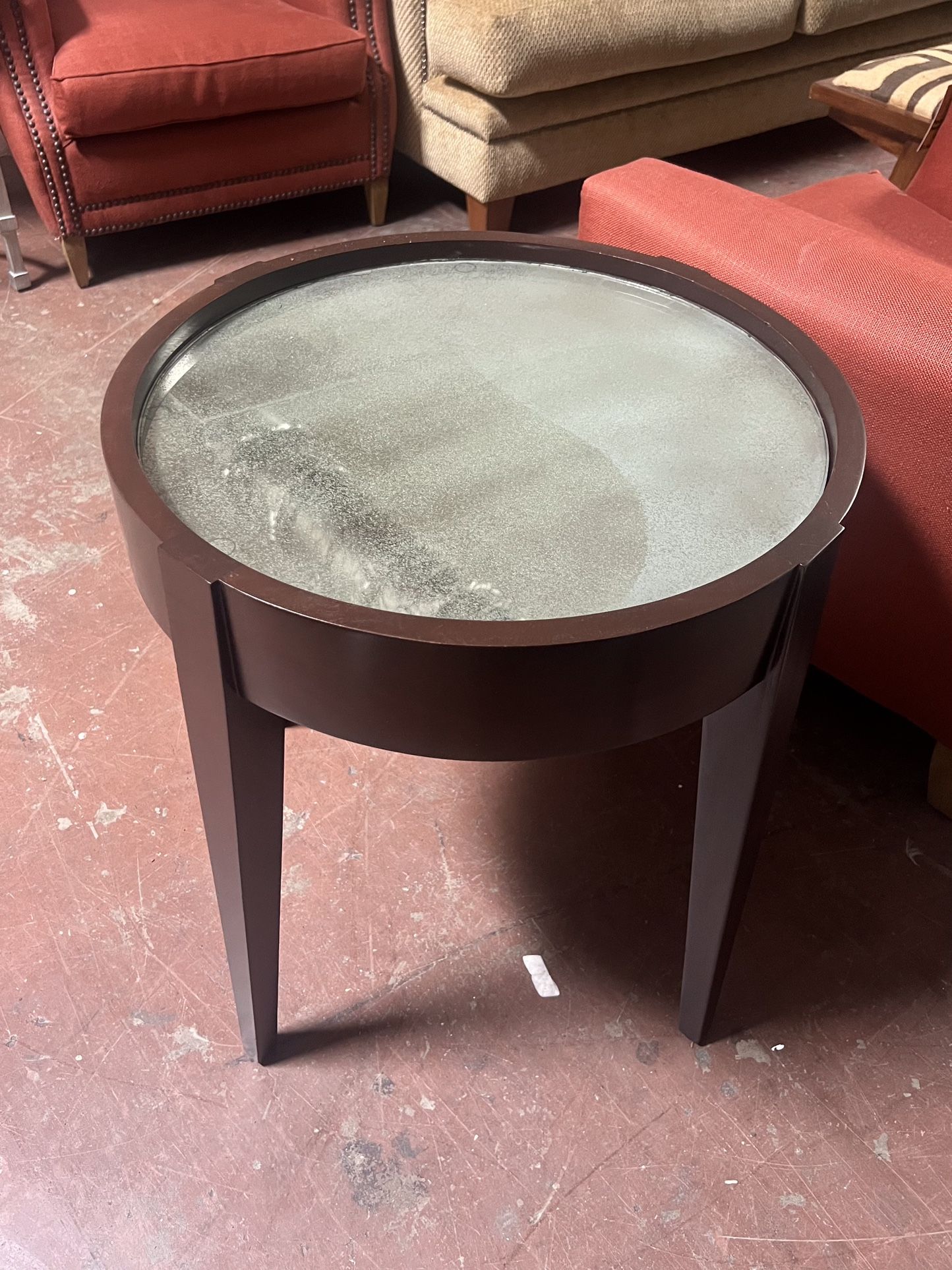 Meredith Baer Round End Table W/ Mercury Glass Inlay Wood base with mercury glass top Dimensions: 20.75” diameter x 22.5”H Delivery available for additional fee Nationwide shipping available. Please message us or call our showroom for an accurate shipping quote. Financing available View the rest of our current inventory at highlinefurniture.com