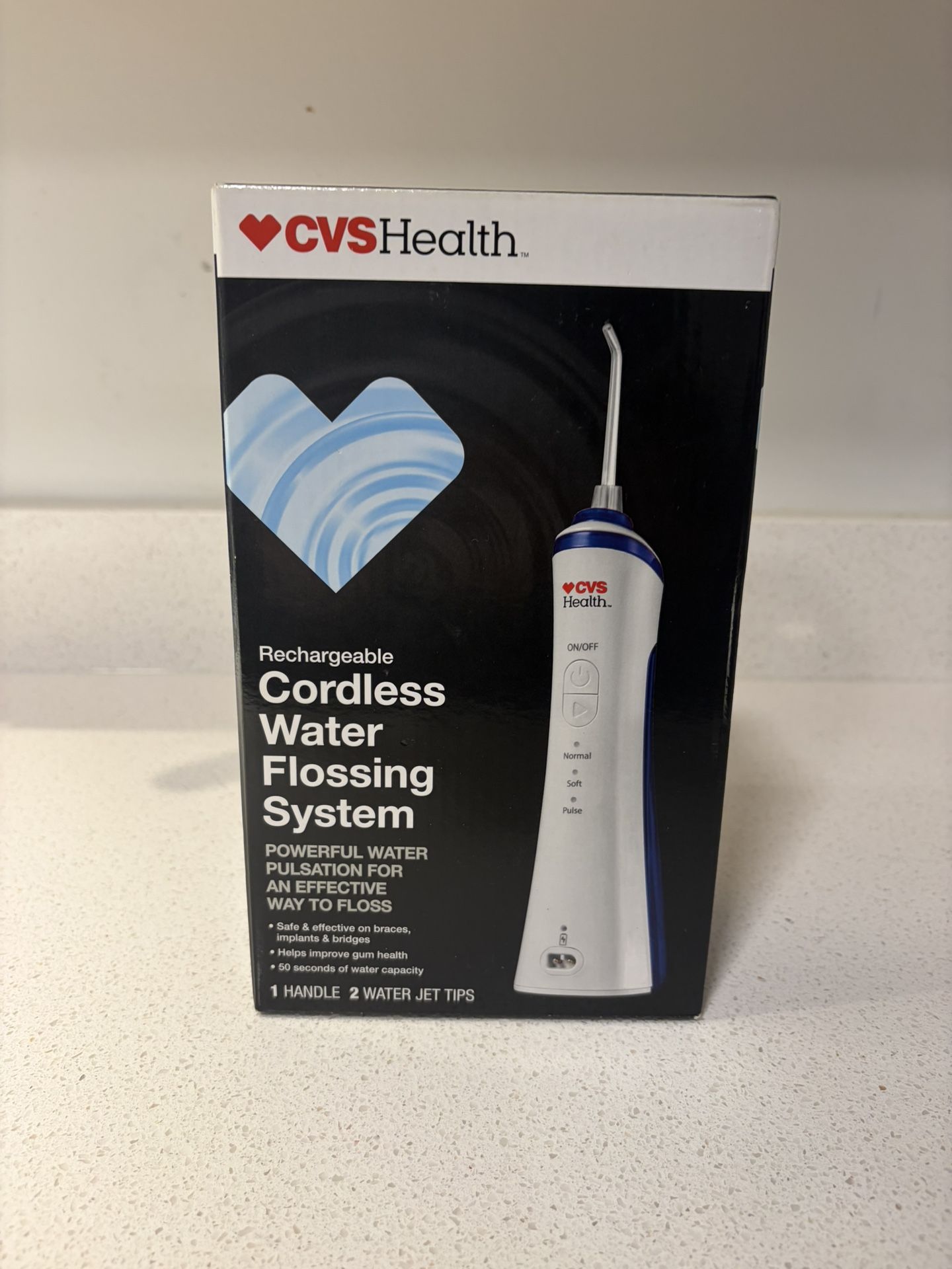 The CVS Rechargeable Cordless Water Flosser System is a convenient and efficient oral care tool for unisex adults. With a pressure range of 30-60 PSI and a flow rate of 7 fl oz per minute, this water flosser can effectively clean and remove plaque from teeth. Powered by batteries and featuring a rechargeable design, this unit is easy to use and maintain. The product comes in a sleek white color and is covered by a 1-year manufacturer warranty, making it a reliable choice for dental hygiene.