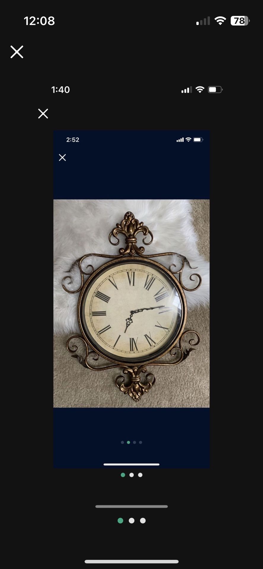 Bronzed gold French style wall clock. About 5 pounds. 11 inch face. 22 inch height. 16 inch width. Uses 1 AA battery.